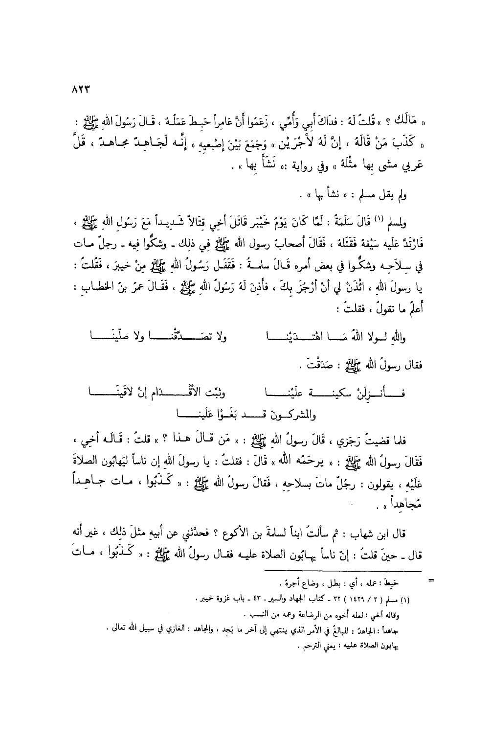 ولمسلم (1) قال سلمة: لما كان يوم خيبر قاتل أخي قتالاً شديداً مع رسول الله صلى الله عليه وسلم، فارتد عليه سيفه فقتله، فقال أصحاب رسول الله صلى الله عليه وسلم في ذلك - وشكوا فيه - رجل مات في سلاحه وشكوا في بعض أمره قال سلمة: فقفل رسول الله صلى الله عليه وسلم من خيبر، فقلت: يا رسول الله، ائذن لي أن أرجز بك، فأذن له رسول الله صلى الله عليه وسلم، فقال عمر بن الخطاب: أعلم ما تقول، فقلت: