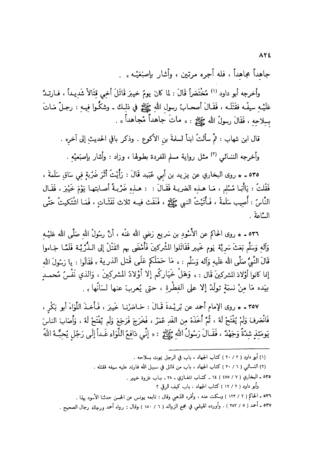 وأخرجه أبو داود (1) مختصراً قال: لما كان يوم خيبر قاتل أخي قتالاً شديداً، فارتد عليه سيفه فقتله، فقال أصحاب رسول الله صلى الله عليه وسلم في ذلك - وشكوا فيه: رجل مات بسلاحه، فقال رسول الله صلى الله عليه وسلم: "مات جاهداً مجاهداً".