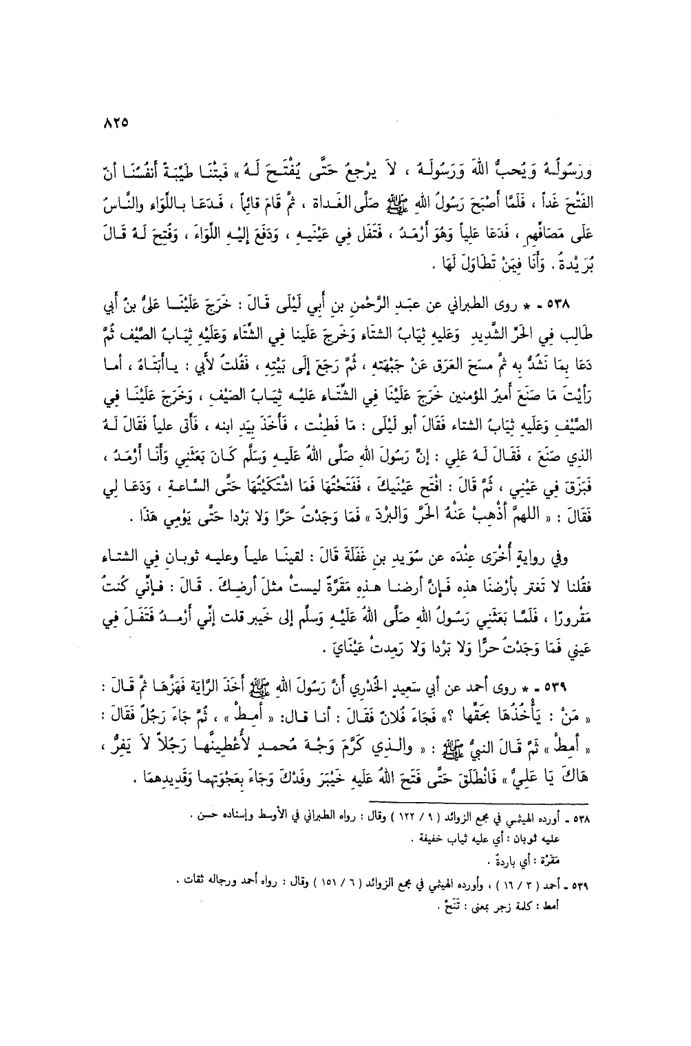 وفي رواية أخرى عنده عن سويد بن غفلة قال: لقينا علياً وعليه ثوبان في الشتاء فقلنا لا تغتر بأرضنا هذه فإن أرضنا هذه مقرة ليست مثل أرضك. قال: فإني كنت مقروراً، فلما بعثني رسول الله صلى الله عليه وسلم إلى خيبر قلت إني أرمد فتفل في عيني فما وجدت حراً ولا برداً ولا رمدت عيناي.
