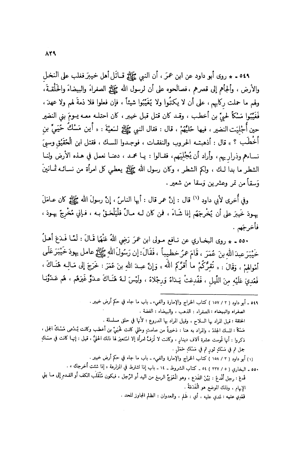 549 - * روى أبو داود عن ابن عمر، أن النبي صلى الله عليه وسلم قاتل أهل خيبر فغلب على النخل والأرض، وألجأهم إلى قصرهم، فصالحوه على أن لرسول الله صلى الله عليه وسلم الصفراء والبيضاء والحلقة، ولهم ما حملت ركابهم، على أن لا يكتموا ولا يغيبوا شيئاً، فإن فعلوا فلا ذمة لهم ولا عهد، فغيبوا مسكاً لحيي بن أخطب، وقد كان قتل قبل خيبر، كان احتمله معه يوم بني النضير حين أجليت النضير، فيها حليهم، قال: فقال النبي صلى الله عليه وسلم لسعية: "أين مسك حيي بن أخطب؟ " قال: أذهبته الحروب والنفقات، فوجدوا المسك، فقتل ابن الحقيق وسبى نساءهم وذراريهم، واراد أن يجليهم، فقالوا: يا محمد، دعنا نعمل في هذه الأرض ولنا الشطر ما بدا لك، ولكم الشطر، وكان رسول الله صلى الله عليه وسلم يعطي كل امرأة من نسائه ثمانين وسقاً من تمر وعشرين وسقا من شعير.
