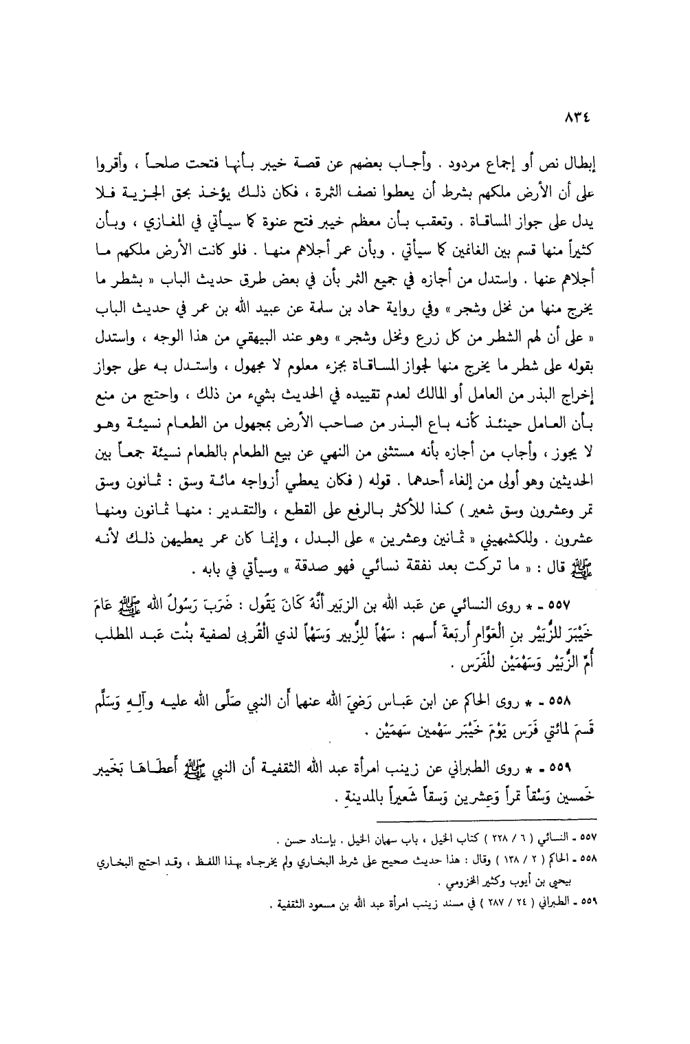 557 - * روى النسائي عن عبد الله بن الزبير أنه كان يقول: ضرب رسول الله صلى الله عليه وسلم عام خيبر للزبير بن العوام أربعة أسهم: سهماً للزبير وسهماً لذي القربى لصفية بنت عبد المطلب أم الزبير وسهمين للفرس.