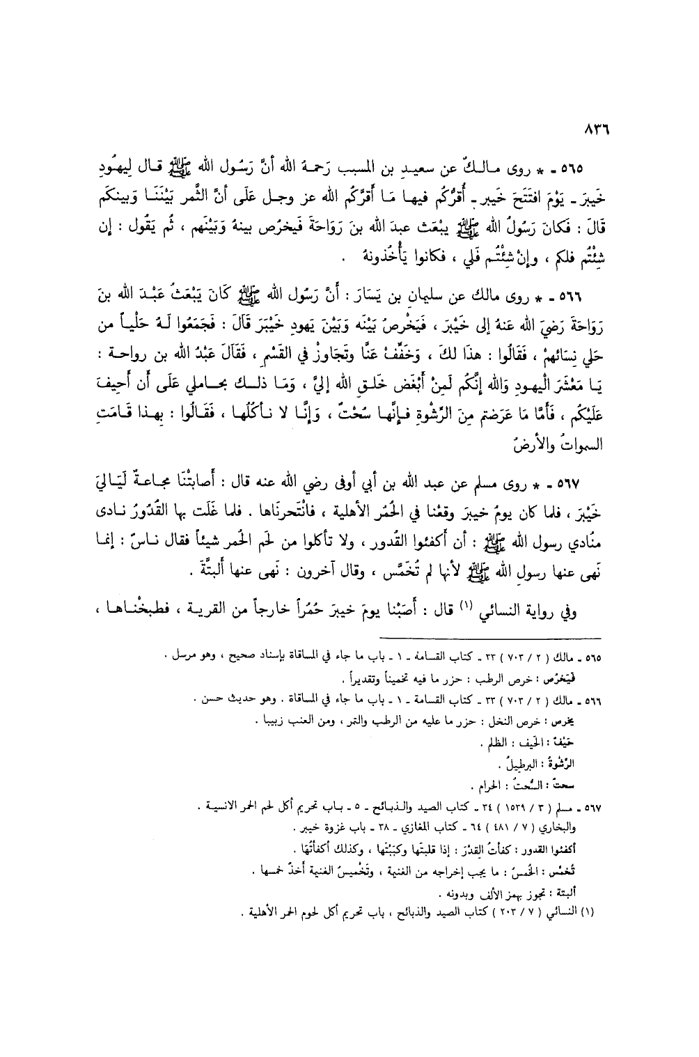 565 - * روى مالك عن سعيد بن المسبب رحمه الله أن رسول الله صلى الله عليه وسلم قال ليهود خيبر - يوم افتتح خيبر - أقركم فيها ما أقركم الله عز وجل على أن الثمر بيننا وبينكم قال: فكان رسول الله صلى الله عليه وسلم يبعث عبد الله بن رواحة فيخرص بينه وبينهم، ثم يقول: إن شئتم فلكم، وإن شئتم فلي، فكانوا يأخذونه.