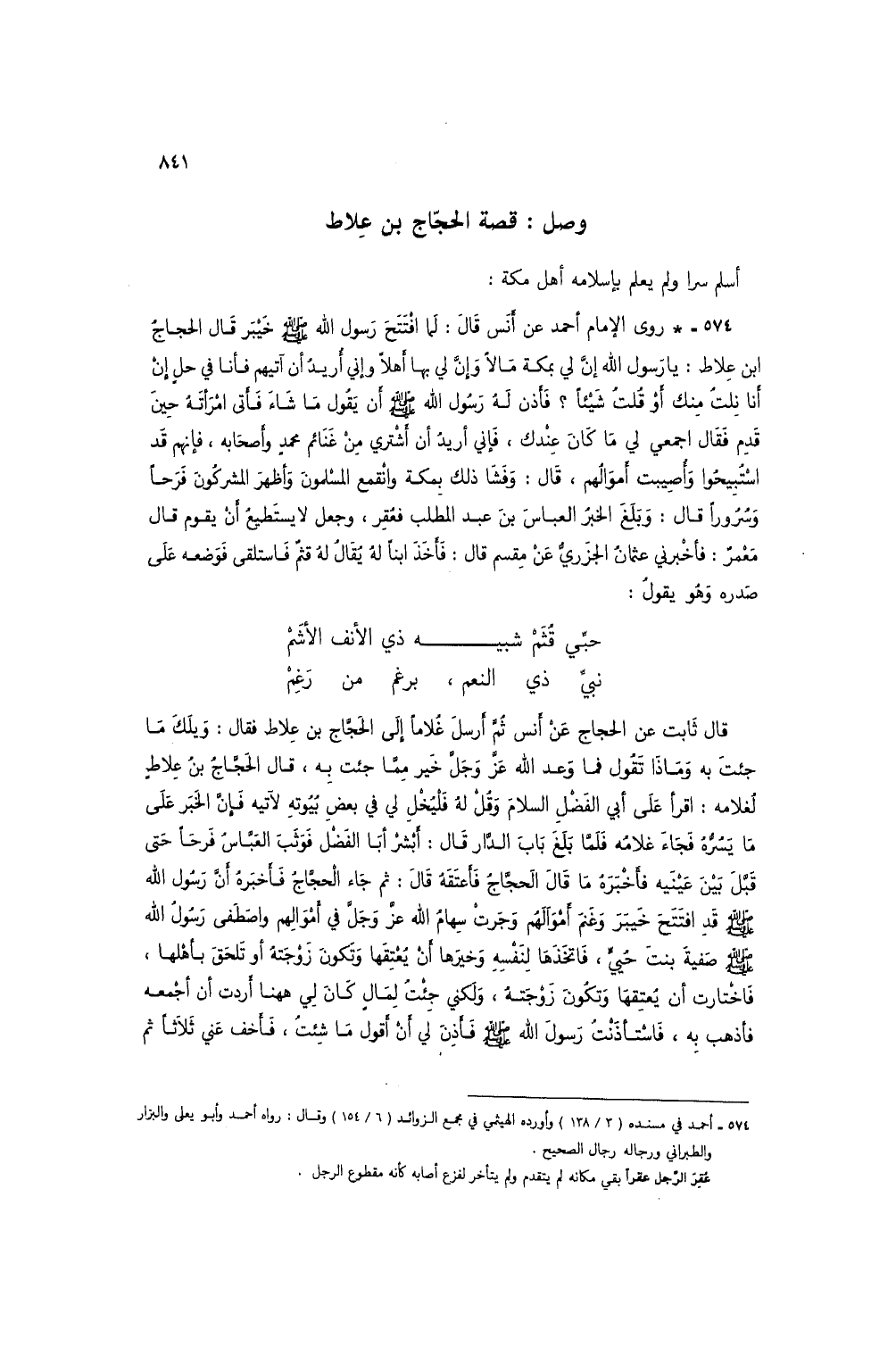 574 - * روى الإمام أحمد عن أنس قال: لما افتتح رسول الله صلى الله عليه وسلم خيبر قال الحجاج ابن علاط: يا رسول الله إن لي بمكة مالاً وإن لي بها أهلاً وإني أريد أن آتيهم فأنا في حل إن أنا نلت منك أو قلت شيئاً؟ فأذن له رسول الله صلى الله عليه وسلم أن يقول ما شاء فأتى امرأته حين قدم فقال اجمعي لي ما كان عندك، فإني أريد أن أشتري من غنائم محمد وأصحابه، فإنهم قد استبيحوا وأصيبت أموالهم، قال: وفشا ذلك بمكة وانقمع المسلمون وأظهر المشركون فرحاً وسروراً قال: وبلغ الخبر العباس بن عبد المطلب فعقر، وجعل لا يستطيع أن يقوم قال معمر: فأخبرني عثمان الجزري عن مقسم قال: فأخذ ابناً له يقال له قثم فاستلقى فوضعه على صدره وهو يقول: