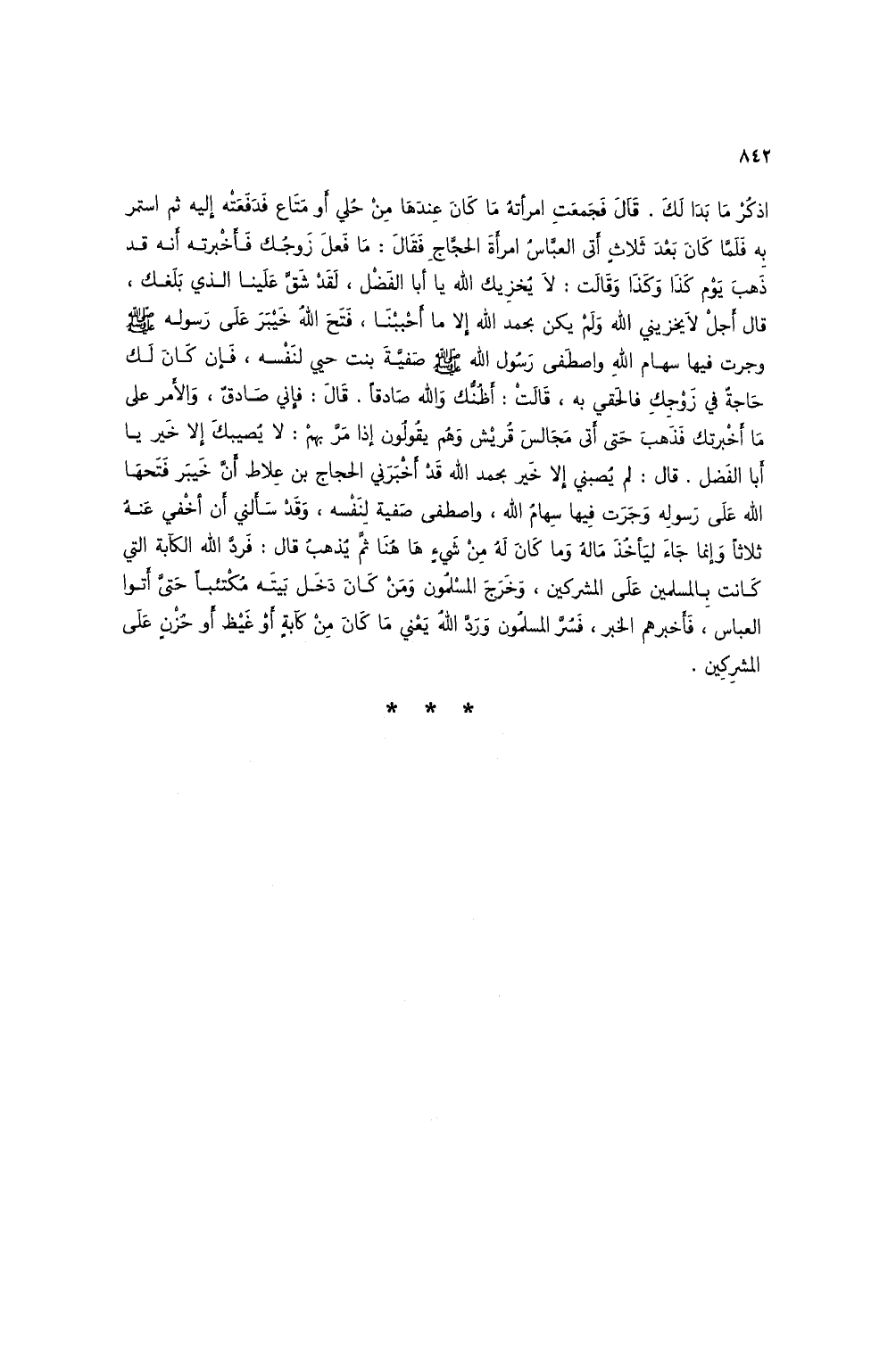 اذكر ما بدا لك. قال فجمعت امرأته ماكان عندها من حلي أو متاع فدفعته إليه ثم استمر به فلما كان بعد ثلاث أتى العباس امرأة الحجاج فقال: ما فعل زوجك فأخبرته أنه قد ذهب يوم كذا وكذا وقالتك لا يخزيك الله يا أبا الفضل، لقد شق علينا الذي بلغك، قال أجل لا يخزيني الله ولم يكن بحمد الله إلا ما أحببنا، فتح الله خيبر على رسوله صلى الله عليه وسلم وجرت فيها سهام الله واصطفى رسول الله صلى الله عليه وسلم صفية بنت حيي لنفسه، فإن كان لك حاجة في زوجك فالحقي به، قالت: أظنك والله صادقاً. قال: فإني صادق، والأمر على ما أخبرتك فذهب حتى أتى مجالس قريش وهم يقولون إذا مر بهم: لا يصيبك إلا خير يا أبا الفضل. قال: لم يصبني إلا خير بحمد الله قد أخبرني الحجاج بن علاط أن خيبر فتحها الله على رسوله وجرت فيها سهام الله، واصطفى صفية لنفسه، وقد سألني أن أخفي عنه ثلاثاً وإنما جاء ليأخذ ماله وما كان له من شيء ها هنا ثم يذهب قال: فرد الله الكآبة التي كانت بالمسلمين على المشركين، وخرج المسلمون ومن كان دخل بيته مكتئباً حتى أتوا العباس، فأخبرهم الخبر، فسر المسلمون ورد الله يعني ما كان من كآبة أو غيظ أو حزن على المشركين.