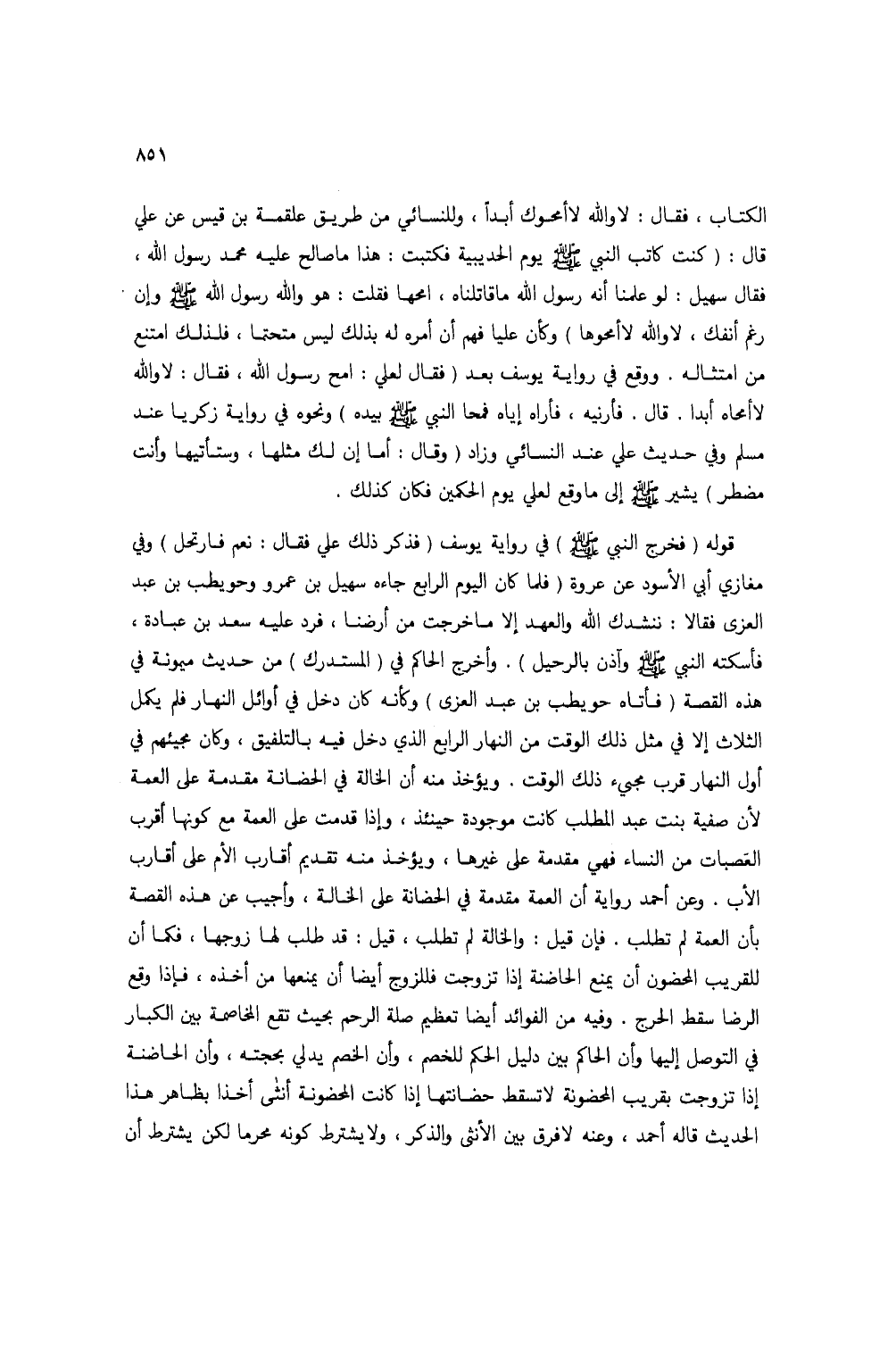 قوله (فخرج النبي صلى الله عليه وسلم) في رواية يوسف (فذكر ذلك علي فقال: نعم فارتحل) وفي مغازي أبي الأسود عن عروة (فلما كان اليوم الرابع جاءه سهيل بن عمرو وحويطب بنعبد العزى فقالا: ننشدك الله والعهد إلا ما خرجت من أرضنا، فرد عليه سعد بن عبادة، فأسكته النبي صلى الله عليه وسلم وآذن بالرحيل). وأخرج الحاكم في (المستدرك) من حديث ميمونة في هذه القصة (فأتاه حويطب بن عبد العزى) وكأنه كان دخل في أوائل النهار فلم يكمل الثلاث إلا في مثل ذلك الوقت من النهار الرابع الذي دخل فيه بالتلفيق، وكان مجيئهم في أول النهار قرب مجيء ذلك الوقت. ويؤخذ منه أن الخالة في الحضانة مقدمة على العمة لأن صفية بنت عبد المطلب كانت موجودة حينئذ، وإذا قدمت على العمة مع كونها أقرب العصبات من النساء فهي مقدمة على غيرها، ويؤخذ منه تقديم أقارب الأم على أقارب الأب. وعن أحمد رواية أن العمة مقدمة في الحضانة على الخالة، وأجيب عن هذه القصة بأن العمة لم تطلب. فإن قيل: والخالة لم تطلب، قيل: قد طلب لها زوجها، فكما أن للقريب المحضون أن يمنع الحاضنة إذا تزوجت فللزوج أيضاً أن يمنعها من أخذه، فإذا وقع الرضا سقط الحرج. وفيه من الفوائد أيضاً تعظيم صلة الرحم بحيث تقع المخاصمة بين الكبار في التوصل إليها وأن الحاكم بين دليل الحكم للخصم، وأنالخصم يدلي بحجته، وأن الحاضنة إذا تزوجت بقريب المحضونة لا تسقط حضانتها إذا كانت المحضونة أنثى أخذاً بظاهر هذا الحديث قاله أحمد، وعنه لا فرق بين الأنثى والذكر، ولا يشترط كونه محرماً لكن يشترط أن