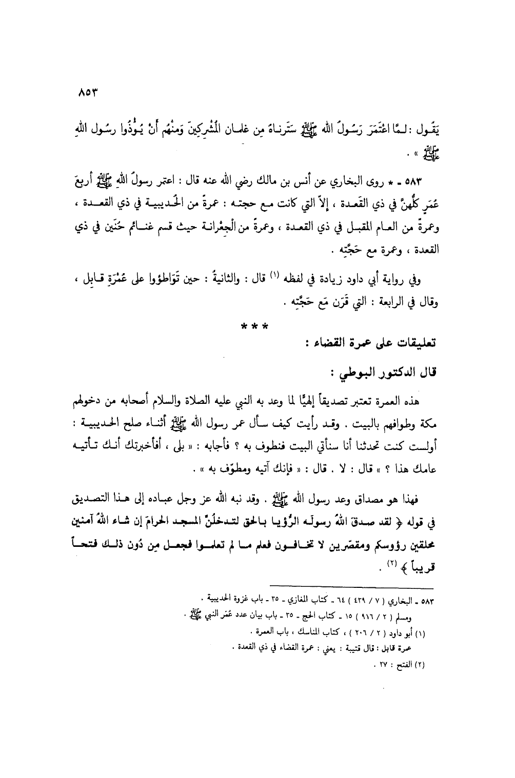 583 - * روى البخاري عن أنس بن مالك رضي الله عنه قال: اعتمر رسول الله صلى الله عليه وسلم أربع عمر كلهن في ذي القعدة، إلا التي كانت مع حجته: عمرة من الحديبية في ذي القعدة، وعمرة من العام المقبل في ذي القعدة، وعمرة من الجعرانة حيث قسم غنائم حنين في ذي القعدة، وعمرة مع حجته.