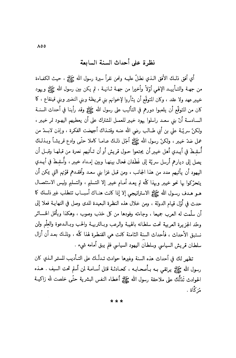 أي أفق ذلك الأفق الذي نطل عليه ونحن نقرأ سيرة رسول الله صلى الله عليه وسلم، حيث الكفاءة من جهة والتأييد الإلهي أولاً وأخيراً من جهة ثانية، لم يكن بين رسول الله صلى الله عليه وسلم ويهود خيبر عهد ولا عقد، وكان المتوقع أن يثأروا لإخوانهم بني قريظة وبني النضير وبني قينقاع، كما كان من المتوقع أن يلعبوا دورهم في التأليب على رسول الله صلى الله عليه وسلم وقد رأينا في أحداث السنة السادسة أن بني سعد راسلوا يهود خيبر للعمل المشترك على أن يعطيهم اليهود تمر خيبر، ولكن سرية علي بن أبي طالب رضي الله عنه وقتذاك أجهضت الفكرة، وإذن لابد من عمل ضد خيبر، ولكن رسول الله صلى الله عليه وسلم أجل ذلك عاماً كاملاً حتى وادع قريشاً وبذلك أسقط في أيدي أهل خيبر أن يجتمعوا حول قريش أو أن تأتيهم نصرة من قبلها وقبل أن يصل إلى ديارهم أرسل سرية إلى غطفان فحال بينها وبين إمداد خيبر، وأسقط في أيدي اليهود أن يأتيهم مدد من هذا الجانب، ومن قبل غزا بني سعد وأفقدهم قوتهم التي يمكن أن يتحركوا بها نحو خيبر وبهذا كله لم يعد أمام خيبر إلا التسليم، والتسليم وليس الاستئصال هو هدف رسول الله صلى الله عليه وسلم الاستراتيجي إلا إذا كانت هناك أسباب تتطلب غير ذلك كما حدث في أول قيام الدولة، ومن خلال هذه النظرة البعيدة المدى وصل في النهاية فعلاً إلى أن سلمت له العرب جميعاً، وجاءته وفودها من كل حدب وصوب، وهكذا وبأقل الخسائر وحد الجزيرة العربية تحت سلطانه بالهيبة والرعب وبالتربية والحب وبالدعوة والعلم ولن نستبق الأحداث، فأحداث السنة الثامنة كانت هي القنطرة لهذا كله، وذلك بعد أن أزال سلطان قريش السياسي وسلطان اليهود السياسي فلم يبق أمامه شيء.