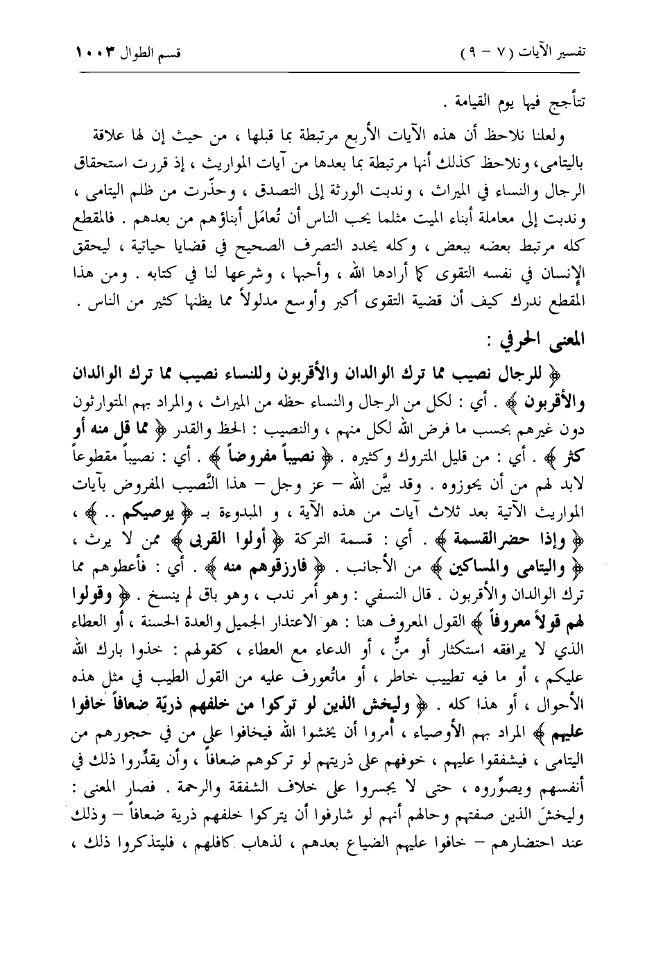 لِلرِّجالِ نَصِيبٌ مِمَّا تَرَكَ الْوالِدانِ وَالْأَقْرَبُونَ وَلِلنِّساءِ نَصِيبٌ مِمَّا تَرَكَ الْوالِدانِ وَالْأَقْرَبُونَ. أي: لكل من الرجال والنساء حظه من الميراث، والمراد بهم المتوارثون دون غيرهم بحسب ما فرض الله لكل منهم، والنصيب: الحظ والقدر مِمَّا قَلَّ مِنْهُ أَوْ كَثُرَ. أي: من قليل المتروك وكثيره. نَصِيباً مَفْرُوضاً. أي: نصيبا مقطوعا لا بد لهم من أن يحوزوه. وقد بين الله- عزّ وجل- هذا النصيب المفروض بآيات المواريث الآتية بعد ثلاث آيات من هذه الآية، والمبدوءة ب يُوصِيكُمُ .. ،