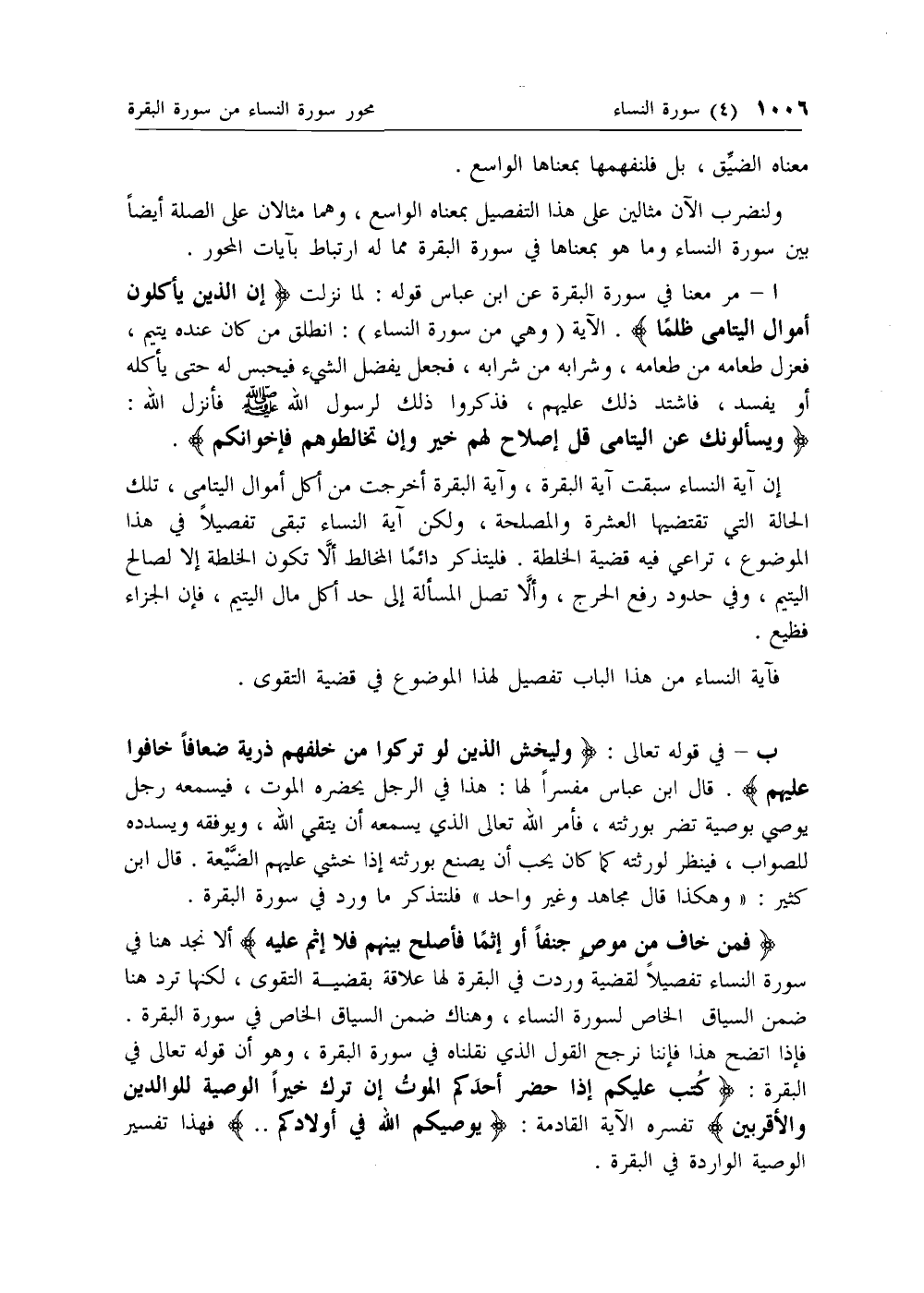 ولنضرب الآن مثالين على هذا التفصيل بمعناه الواسع، وهما مثالان على الصلة أيضا بين سورة النساء وما هو بمعناها في سورة البقرة مما له ارتباط بآيات المحور.
