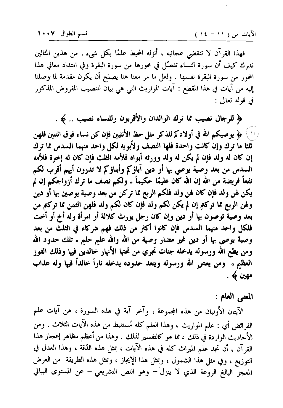 الآيتان الأوليان من هذه المجموعة، وآخر آية في هذه السورة، هن آيات علم الفرائض أي: علم المواريث، وهذا العلم كله مستنبط من هذه الآيات الثلاث. ومن الأحاديث الواردة في ذلك، مما هو كالتفسير لذلك. وهذا من أعظم مظاهر إعجاز هذا القرآن، أن تجد علم الميراث كله في هذه الآيات، بمثل هذه الدقة، وهذا العدل في التوزيع، وفي مثل هذا الشمول، وبمثل هذا الإيجاز، وبمثل هذه الطريقة من العرض المعجز البالغ الروعة الذي لا ينزل- وهو النص التشريعي- عن المستوى البياني