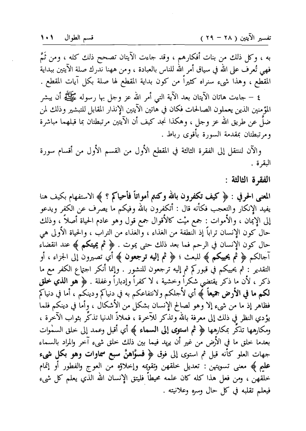 المعنى الحرفي: كَيْفَ تَكْفُرُونَ بِاللَّهِ وَكُنْتُمْ أَمْواتاً فَأَحْياكُمْ؟ الاستفهام بكيف هنا يفيد الإنكار والتعجب فكأنه قال: أتكفرون بالله وفيكم ما يصرف عن الكفر ويدعو إلى الإيمان، والأموات: جمع ميت كالأقوال جمع قول وهو عادم الحياة أصلا، وذلك حال كون الإنسان ترابا إذ النطفة من الغذاء، والغذاء من التراب، والحياة الأولى هي حال كون الإنسان في الرحم فما بعد ذلك حتى يموت. ثُمَّ يُمِيتُكُمْ عند انقضاء آجالكم ثُمَّ يُحْيِيكُمْ للبعث؛ ثُمَّ إِلَيْهِ تُرْجَعُونَ أي تصيرون إلى الجزاء، أو التقدير: ثم يحييكم في قبوركم ثم إليه ترجعون للنشور. وإنما أنكر اجتماع الكفر مع ما ذكر، لأن ما ذكر يقتضي شكرا وخشية، لا كفرا وإدبارا وغفلة.