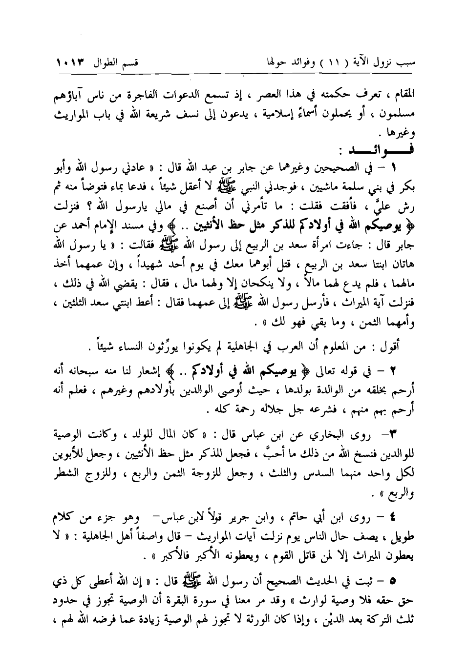 1 - في الصحيحين وغيرهما عن جابر بن عبد الله قال: «عادني رسول الله وأبو بكر في بني سلمة ماشيين، فوجدني النبي صلى الله عليه وسلم لا أعقل شيئا، فدعا بماء فتوضأ منه ثم رش علي، فأفقت فقلت: ما تأمرني أن أصنع في مالي يا رسول الله؟ فنزلت يُوصِيكُمُ اللَّهُ فِي أَوْلادِكُمْ لِلذَّكَرِ مِثْلُ حَظِّ الْأُنْثَيَيْنِ .. وفي مسند الإمام أحمد عن جابر قال: جاءت امرأة سعد بن الربيع إلى رسول الله صلى الله عليه وسلم فقالت: «يا رسول الله هاتان ابنتا سعد بن الربيع، قتل أبوهما معك في يوم أحد شهيدا، وإن عمهما أخذ مالهما، فلم يدع لهما مالا، ولا ينكحان إلا ولهما مال، فقال: يقضي الله في ذلك، فنزلت آية الميراث، فأرسل رسول الله صلى الله عليه وسلم إلى عمهما فقال: أعط ابنتي سعد الثلثين، وأمهما الثمن، وما بقي فهو لك».