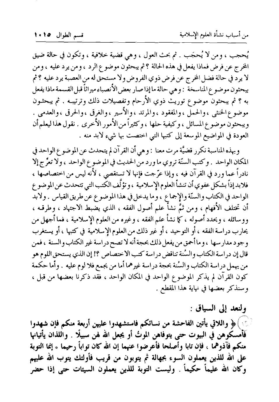 وبهذه المناسبة نكرر قضية مرت معنا: وهي أن القرآن لم يتحدث عن الموضوع الواحد في المكان الواحد. وكتب السنة تروي ما ورد من الحديث في الموضوع الواحد، ولا تعرج إلا نادرا عما ورد في القرآن فيه، وإذا عرجت فإنها لا تستقصي، لأنه ليس من اختصاصها، فلا بد إذا بشكل عفوي أن تنشأ العلوم الإسلامية، وتؤلف الكتب التي تتحدث عن الموضوع الواحد في الكتاب والسنة والإجماع، وما يدخل في هذا الموضوع عن طريق القياس. ولا بد أن تختلف الأفهام، ومن ثم نشأ علم أصول الفقه، الذي يضبط الاجتهاد، وطرقه، ووسائله، ويحدد أصوله، كما نشأ علم الفقه، وغيره من العلوم الإسلامية، فما أجهل من يحارب دراسة الفقه، أو التوحيد، أو غير ذلك من العلوم الإسلامية في كتبها، أو يستغرب وجود مدارسها، وما أحمق من يفعل ذلك بحجة أنه لا تصح دراسة غير الكتاب والسنة، فمن قال إن دراسة الكتاب والسنة تناقض دراسة كتب الاختصاص؟! إن الذي يستحق اللوم هو من يهمل دراسة الكتاب والسنة بحجة دراسة غيرهما أما من يجمع فلا لوم عليه. وأما حكمة كون القرآن لم يذكر الموضوع الواحد في المكان الواحد، فقد ذكرنا بعضها من قبل، وسنذكر بعضها في نهاية هذا المقطع.