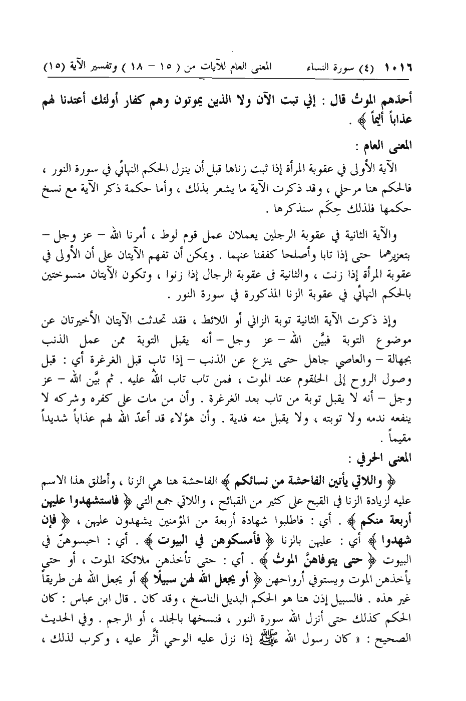 وَاللَّاتِي يَأْتِينَ الْفاحِشَةَ مِنْ نِسائِكُمْ الفاحشة هنا هي الزنا، وأطلق هذا الاسم عليه لزيادة الزنا في القبح على كثير من القبائح، واللاتي جمع التي فَاسْتَشْهِدُوا عَلَيْهِنَّ أَرْبَعَةً مِنْكُمْ. أي: فاطلبوا شهادة أربعة من المؤمنين يشهدون عليهن، فَإِنْ شَهِدُوا أي: عليهن بالزنا فَأَمْسِكُوهُنَّ فِي الْبُيُوتِ. أي: احبسوهن في البيوت حَتَّى يَتَوَفَّاهُنَّ الْمَوْتُ. أي: حتى تأخذهن ملائكة الموت، أو حتى يأخذهن الموت ويستوفي أرواحهن أَوْ يَجْعَلَ اللَّهُ لَهُنَّ سَبِيلًا أو يجعل الله لهن طريقا غير هذه. فالسبيل إذن هنا هو الحكم البديل الناسخ، وقد كان. قال ابن عباس: كان الحكم كذلك حتى أنزل الله سورة النور، فنسخها بالجلد، أو الرجم. وفي الحديث الصحيح: «كان رسول الله صلى الله عليه وسلم إذا نزل عليه الوحي أثر عليه، وكرب لذلك،