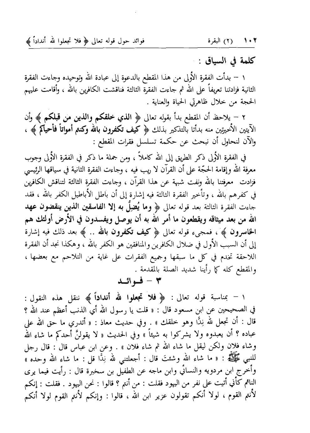 1 - بمناسبة قوله تعالى: فَلا تَجْعَلُوا لِلَّهِ أَنْداداً ننقل هذه النقول: