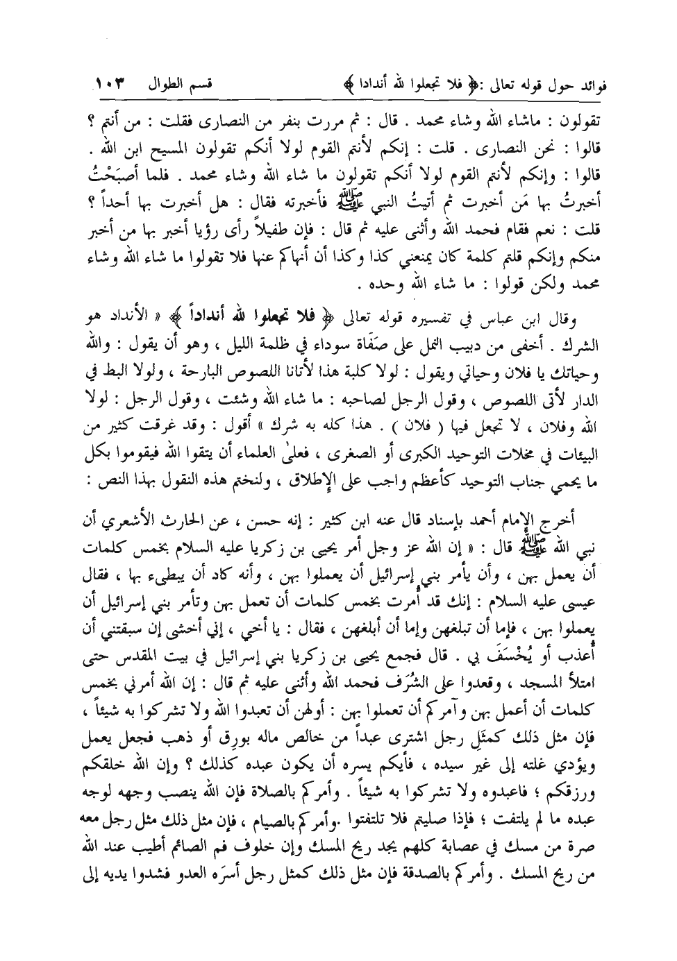 وقال ابن عباس في تفسيره قوله تعالى فَلا تَجْعَلُوا لِلَّهِ أَنْداداً «الأنداد هو الشرك. أخفى من دبيب النمل على صفاة سوداء في ظلمة الليل، وهو أن يقول: والله وحياتك يا فلان وحياتي ويقول: لولا كلبة هذا لأتانا اللصوص البارحة، ولولا البط في الدار لأتى اللصوص، وقول الرجل لصاحبه: ما شاء الله وشئت، وقول الرجل: لولا الله وفلان، لا تجعل فيها (فلان). هذا كله به شرك» أقول: وقد غرقت كثير من البيئات في مخلات التوحيد الكبرى أو الصغرى، فعلى العلماء أن يتقوا الله فيقوموا بكل ما يحمي جناب التوحيد كأعظم واجب على الإطلاق، ولنختم هذه النقول بهذا النص: