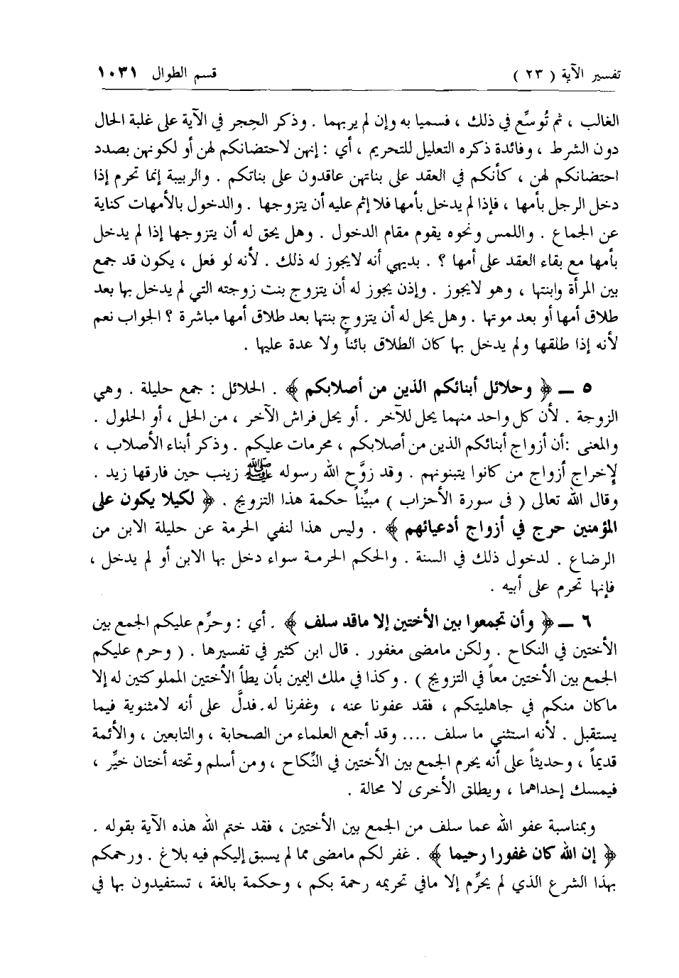 5 - وَحَلائِلُ أَبْنائِكُمُ الَّذِينَ مِنْ أَصْلابِكُمْ. الحلائل: جمع حليلة. وهي الزوجة. لأن كل واحد منهما يحل للآخر. أو يحل فراش الآخر، من الحل، أو الحلول.