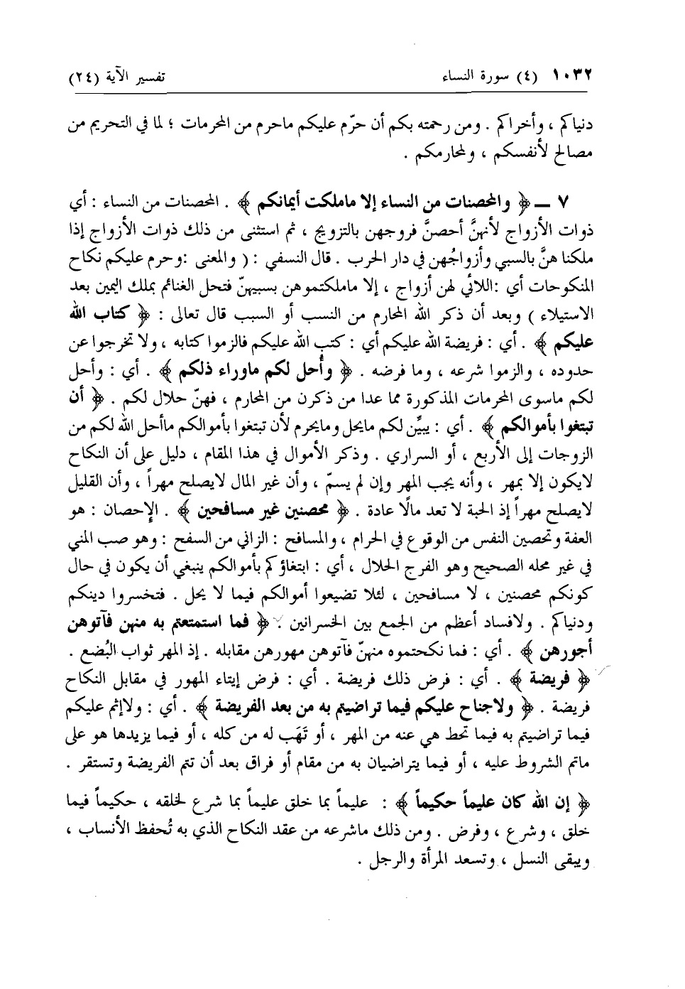 7 - وَالْمُحْصَناتُ مِنَ النِّساءِ إِلَّا ما مَلَكَتْ أَيْمانُكُمْ. المحصنات من النساء: أي ذوات الأزواج لأنهن أحصن فروجهن بالتزويج، ثم استثنى من ذلك ذوات الأزواج إذا ملكناهن بالسبي وأزواجهن في دار الحرب. قال النسفي: (والمعنى: وحرم عليكم نكاح المنكوحات أي: اللائي لهن أزواج، إلا ما ملكتموهن بسبيهن فتحل الغنائم بملك اليمين بعد الاستيلاء) وبعد أن ذكر الله المحارم من النسب أو السبب قال تعالى: كِتابَ اللَّهِ عَلَيْكُمْ. أي: فريضة الله عليكم أي: كتب الله عليكم فالزموا كتابه، ولا تخرجوا عن حدوده، والزموا شرعه، وما فرضه. وَأُحِلَّ لَكُمْ ما وَراءَ ذلِكُمْ. أي: وأحل لكم ما سوى المحرمات المذكورة مما عدا من ذكرن من المحارم، فهن حلال لكم. أَنْ تَبْتَغُوا بِأَمْوالِكُمْ. أي: يبين لكم ما يحل وما يحرم لأن تبتغوا بأموالكم ما أحل الله لكم من الزوجات إلى الأربع، أو السراري. وذكر الأموال في هذا المقام، دليل على أن النكاح لا يكون إلا بمهر، وأنه يجب المهر وإن لم يسم، وأن غير المال لا يصلح مهرا، وأن القليل لا يصلح مهرا إذ الحبة لا تعد مالا عادة. مُحْصِنِينَ غَيْرَ مُسافِحِينَ. الإحصان: هو العفة وتحصين النفس من الوقوع في الحرام، والمسافح: الزاني من السفح: وهو صب المني في غير محله الصحيح وهو الفرج الحلال، أي: ابتغاؤكم بأموالكم ينبغي أن يكون في حال كونكم محصنين، لا مسافحين، لئلا تضيعوا أموالكم فيما لا يحل. فتخسروا دينكم ودنياكم. ولا فساد أعظم من الجمع بين الخسرانين. فَمَا اسْتَمْتَعْتُمْ بِهِ مِنْهُنَّ فَآتُوهُنَّ أُجُورَهُنَّ. أي: فما نكحتموه منهن فآتوهن مهورهن مقابله. إذ المهر ثواب البضع.