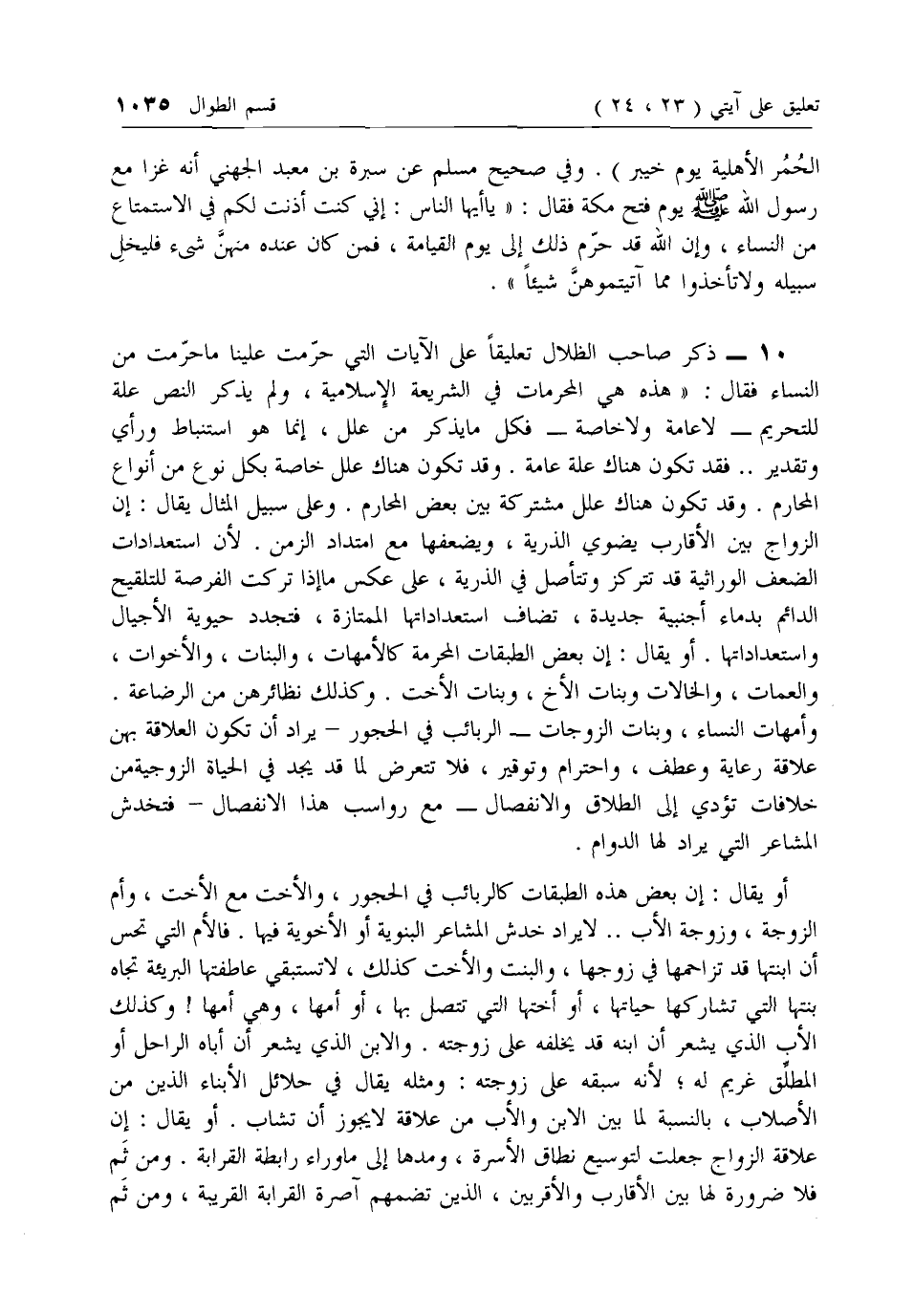 10 - ذكر صاحب الظلال تعليقا على الآيات التي حرمت علينا ما حرمت من النساء فقال: «هذه هي المحرمات في الشريعة الإسلامية، ولم يذكر النص علة للتحريم- لا عامة ولا خاصة- فكل ما يذكر من علل، إنما هو استنباط ورأي وتقدير .. فقد تكون هناك علة عامة. وقد تكون هناك علل خاصة بكل نوع من أنواع المحارم. وقد تكون هناك علل مشتركة بين بعض المحارم. وعلى سبيل المثال يقال: إن الزواج بين الأقارب يضوي الذرية، ويضعفها مع امتداد الزمن. لأن استعدادات الضعف الوراثية قد تتركز وتتأصل في الذرية، على عكس ما إذا تركت الفرصة للتلقيح الدائم بدماء أجنبية جديدة، تضاف استعداداتها الممتازة، فتجدد حيوية الأجيال واستعداداتها. أو يقال: إن بعض الطبقات المحرمة كالأمهات، والبنات، والأخوات، والعمات، والخالات وبنات الأخ، وبنات الأخت. وكذلك نظائرهن من الرضاعة.