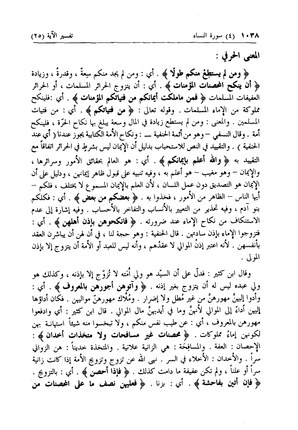 وَمَنْ لَمْ يَسْتَطِعْ مِنْكُمْ طَوْلًا. أي: ومن لم يجد منكم سعة، وقدرة، وزيادة أَنْ يَنْكِحَ الْمُحْصَناتِ الْمُؤْمِناتِ. أي: أن يتزوج الحرائر المسلمات، أو الحرائر العفيفات المسلمات فَمِنْ ما مَلَكَتْ أَيْمانُكُمْ مِنْ فَتَياتِكُمُ الْمُؤْمِناتِ. أي: فلينكح مملوكة من الإماء المسلمات. وقوله تعالى: مِنْ فَتَياتِكُمُ. أي: من فتيات المسلمين. والمعنى: ومن لم يستطع زيادة في المال وسعة يبلغ بها نكاح الحرة، فلينكح أمة. وقال النسفي- وهو من أئمة الحنفية-: ونكاح الأمة الكتابية يجوز عندنا (أي عند الحنفية). والتقييد في النص للاستحباب بدليل أن الإيمان ليس بشرط في الحرائر اتفاقا مع التقييد به وَاللَّهُ أَعْلَمُ بِإِيمانِكُمْ. أي: هو العالم بحقائق الأمور وسرائرها، والإيمان- وهو مغيب- هو أعلم به، وفيه تنبيه على قبول ظاهر إيمانهن، ودليل على أن الإيمان هو التصديق دون عمل اللسان، لأن العلم بالإيمان المسموع لا يختلف، فلكم- أيها الناس- الظاهر من الأمور، فخذوا به. بَعْضُكُمْ مِنْ بَعْضٍ. أي: فكلكم بنو آدم، وفيه تحذير من التعيير بالأنساب والتفاخر بالأحساب. وفيه إشارة إلى عدم الاستنكاف من نكاح الإماء عند ضرورته. فَانْكِحُوهُنَّ بِإِذْنِ أَهْلِهِنَّ. أي: