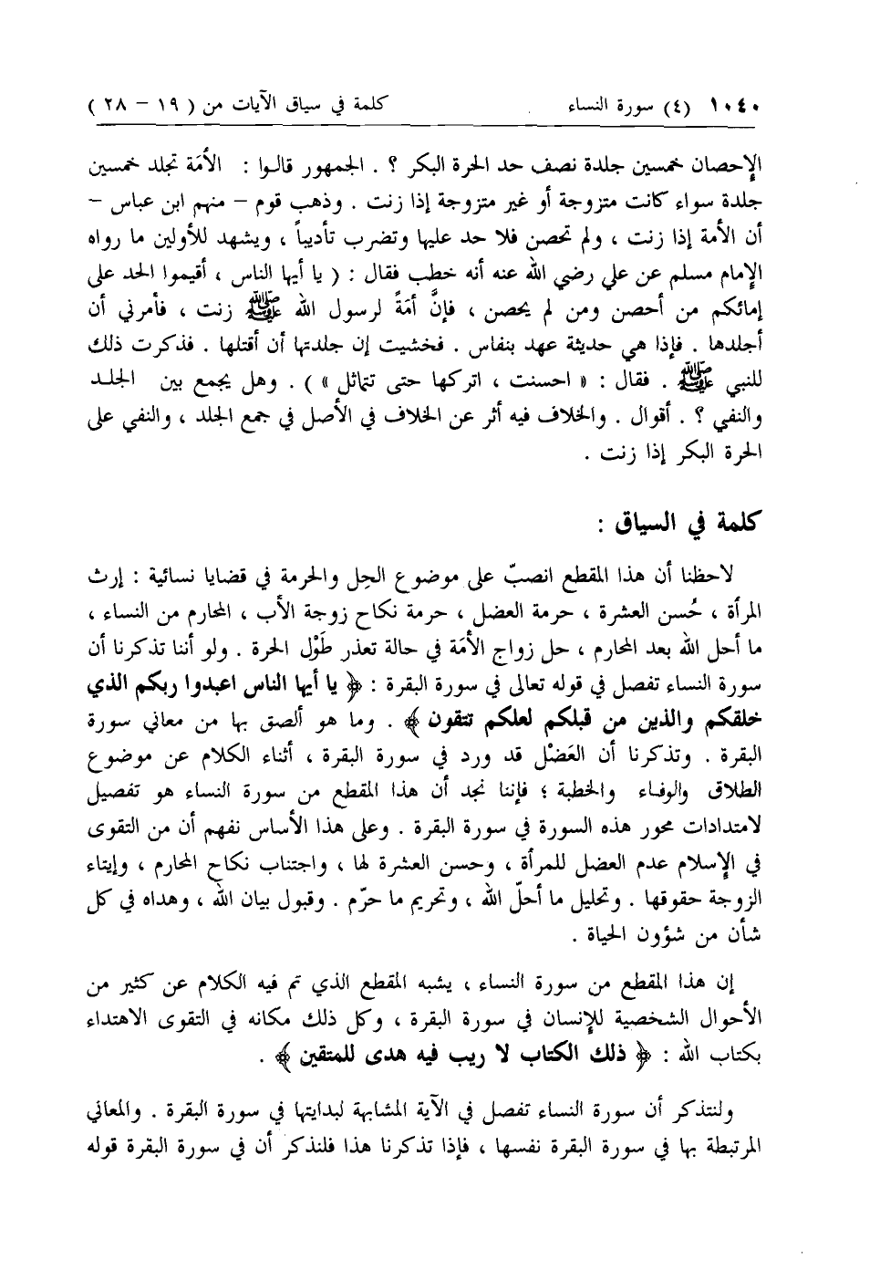 لاحظنا أن هذا المقطع انصب على موضوع الحل والحرمة في قضايا نسائية: إرث المرأة، حسن العشرة، حرمة العضل، حرمة نكاح زوجة الأب، المحارم من النساء، ما أحل الله بعد المحارم، حل زواج الأمة في حالة تعذر طول الحرة. ولو أننا تذكرنا أن سورة النساء تفصل في قوله تعالى في سورة البقرة: يا أَيُّهَا النَّاسُ اعْبُدُوا رَبَّكُمُ الَّذِي خَلَقَكُمْ وَالَّذِينَ مِنْ قَبْلِكُمْ لَعَلَّكُمْ تَتَّقُونَ. وما هو ألصق بها من معاني سورة البقرة. وتذكرنا أن العضل قد ورد في سورة البقرة، أثناء الكلام عن موضوع الطلاق والوفاء والخطبة؛ فإننا نجد أن هذا المقطع من سورة النساء هو تفصيل لامتدادات محور هذه السورة في سورة البقرة. وعلى هذا الأساس نفهم أن من التقوى في الإسلام عدم العضل للمرأة، وحسن العشرة لها، واجتناب نكاح المحارم، وإيتاء الزوجة حقوقها. وتحليل ما أحل الله، وتحريم ما حرم. وقبول بيان الله، وهداه في كل شأن من شئون الحياة.