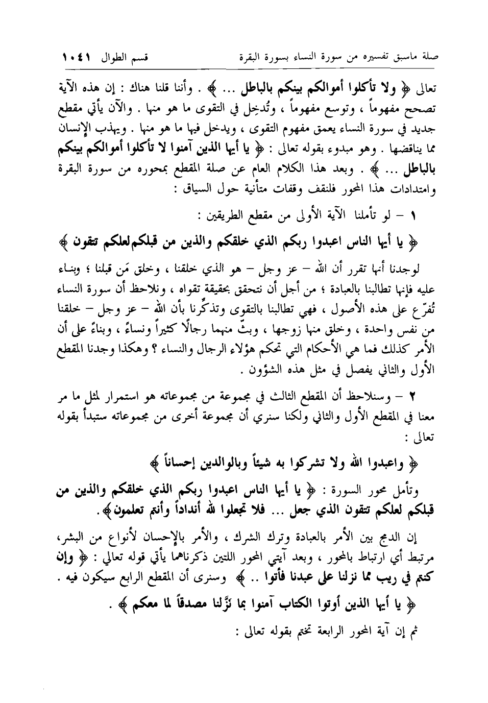 تعالى وَلا تَأْكُلُوا أَمْوالَكُمْ بَيْنَكُمْ بِالْباطِلِ .... وأننا قلنا هناك: إن هذه الآية تصحح مفهوما، وتوسع مفهوما، وتدخل في التقوى ما هو منها. والآن يأتي مقطع جديد في سورة النساء يعمق مفهوم التقوى، ويدخل فيها ما هو منها. ويهذب الإنسان مما يناقضها. وهو مبدوء بقوله تعالى: يا أَيُّهَا الَّذِينَ آمَنُوا لا تَأْكُلُوا أَمْوالَكُمْ بَيْنَكُمْ بِالْباطِلِ .... وبعد هذا الكلام العام عن صلة المقطع بمحوره من سورة البقرة وامتدادات هذا المحور فلنقف وقفات متأنية حول السياق: