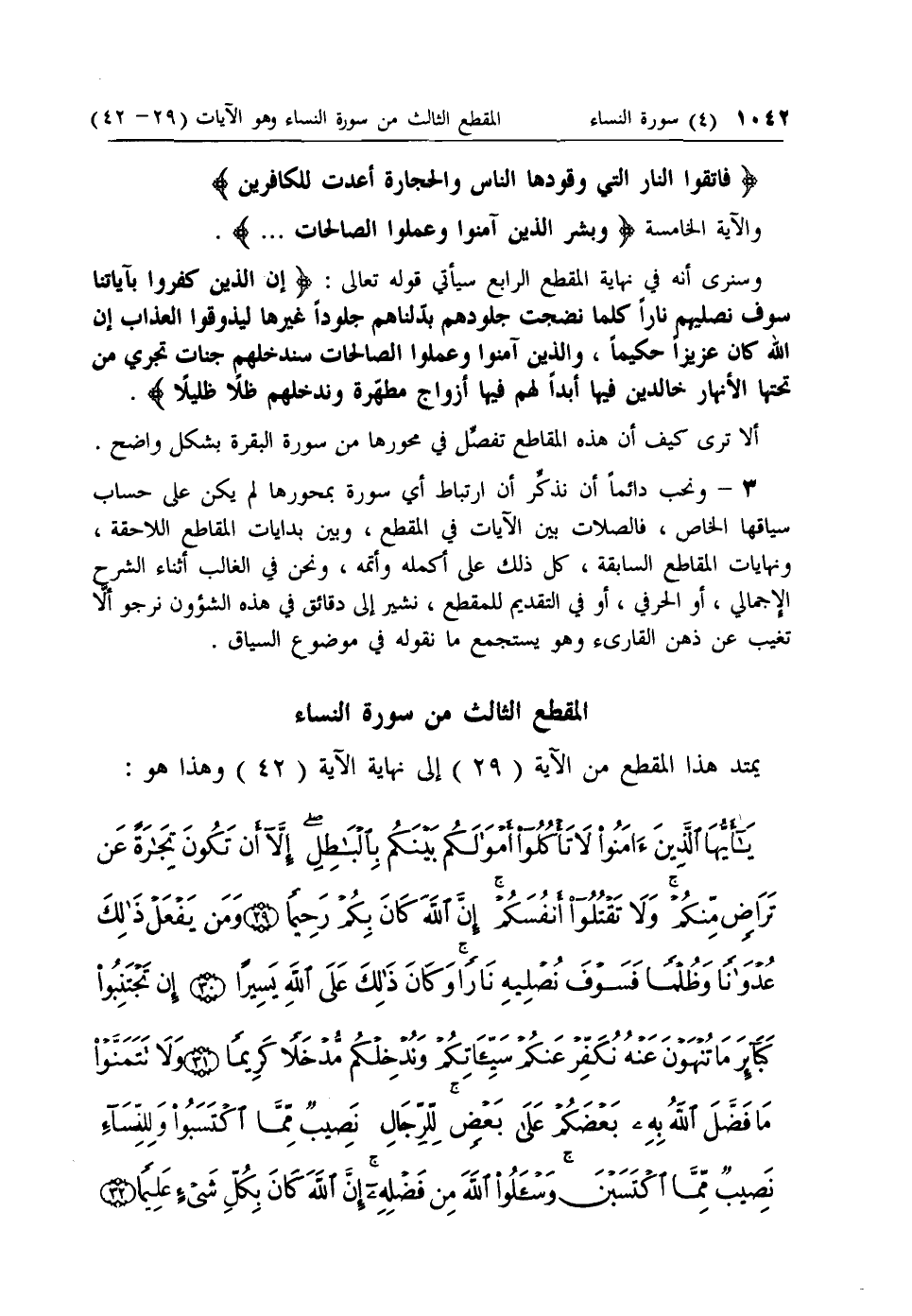 3 - ونحب دائما أن نذكر أن ارتباط أي سورة بمحورها لم يكن على حساب سياقها الخاص، فالصلات بين الآيات في المقطع، وبين بدايات المقاطع اللاحقة، ونهايات المقاطع السابقة، كل ذلك على أكمله وأتمه، ونحن في الغالب أثناء الشرح الإجمالي، أو الحرفي، أو في التقديم للمقطع، نشير إلى دقائق في هذه الشئون نرجو ألا تغيب عن ذهن القارئ وهو يستجمع ما نقوله في موضوع السياق.