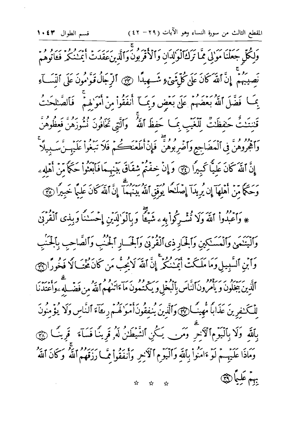 وَلِكُلٍّ جَعَلْنا مَوالِيَ مِمَّا تَرَكَ الْوالِدانِ وَالْأَقْرَبُونَ وَالَّذِينَ عَقَدَتْ أَيْمانُكُمْ فَآتُوهُمْ نَصِيبَهُمْ إِنَّ اللَّهَ كانَ عَلى كُلِّ شَيْءٍ شَهِيداً (33) الرِّجالُ قَوَّامُونَ عَلَى النِّساءِ بِما فَضَّلَ اللَّهُ بَعْضَهُمْ عَلى بَعْضٍ وَبِما أَنْفَقُوا مِنْ أَمْوالِهِمْ فَالصَّالِحاتُ قانِتاتٌ حافِظاتٌ لِلْغَيْبِ بِما حَفِظَ اللَّهُ وَاللاَّتِي تَخافُونَ نُشُوزَهُنَّ فَعِظُوهُنَّ وَاهْجُرُوهُنَّ فِي الْمَضاجِعِ وَاضْرِبُوهُنَّ فَإِنْ أَطَعْنَكُمْ فَلا تَبْغُوا عَلَيْهِنَّ سَبِيلاً إِنَّ اللَّهَ كانَ عَلِيًّا كَبِيراً (34) وَإِنْ خِفْتُمْ شِقاقَ بَيْنِهِما فَابْعَثُوا حَكَماً مِنْ أَهْلِهِ وَحَكَماً مِنْ أَهْلِها إِنْ يُرِيدا إِصْلاحاً يُوَفِّقِ اللَّهُ بَيْنَهُما إِنَّ اللَّهَ كانَ عَلِيماً خَبِيراً (35) وَاعْبُدُوا اللَّهَ وَلا تُشْرِكُوا بِهِ شَيْئاً وَبِالْوالِدَيْنِ إِحْساناً وَبِذِي الْقُرْبى وَالْيَتامى وَالْمَساكِينِ وَالْجارِ ذِي الْقُرْبى وَالْجارِ الْجُنُبِ وَالصَّاحِبِ بِالْجَنْبِ وَابْنِ السَّبِيلِ وَما مَلَكَتْ أَيْمانُكُمْ إِنَّ اللَّهَ لا يُحِبُّ مَنْ كانَ مُخْتالاً فَخُوراً (36) الَّذِينَ يَبْخَلُونَ وَيَأْمُرُونَ النَّاسَ بِالْبُخْلِ وَيَكْتُمُونَ ما آتاهُمُ اللَّهُ مِنْ فَضْلِهِ وَأَعْتَدْنا لِلْكافِرِينَ عَذاباً مُهِيناً (37)