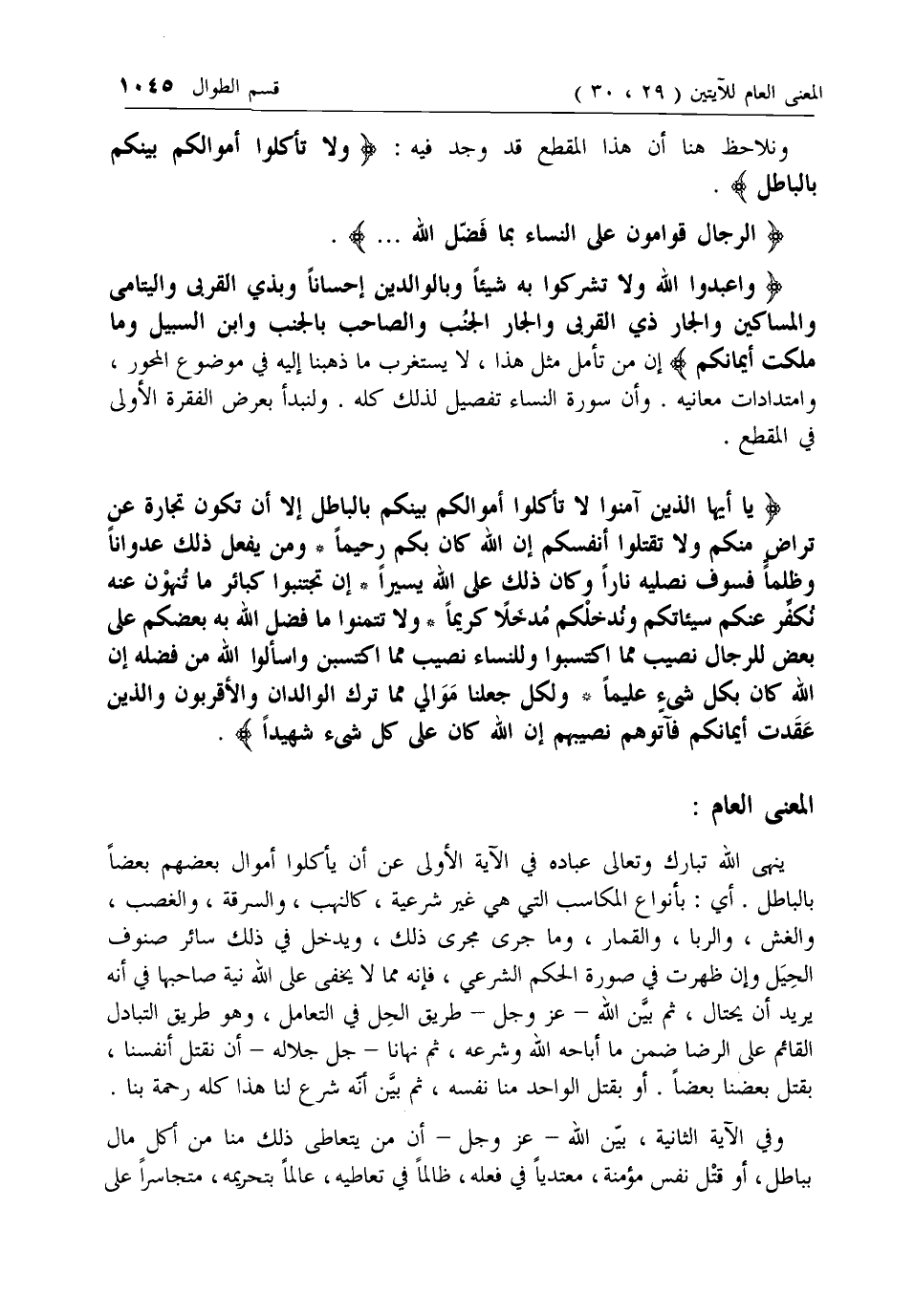 يا أَيُّهَا الَّذِينَ آمَنُوا لا تَأْكُلُوا أَمْوالَكُمْ بَيْنَكُمْ بِالْباطِلِ إِلَّا أَنْ تَكُونَ تِجارَةً عَنْ تَراضٍ مِنْكُمْ وَلا تَقْتُلُوا أَنْفُسَكُمْ إِنَّ اللَّهَ كانَ بِكُمْ رَحِيماً* وَمَنْ يَفْعَلْ ذلِكَ عُدْواناً وَظُلْماً فَسَوْفَ نُصْلِيهِ ناراً وَكانَ ذلِكَ عَلَى اللَّهِ يَسِيراً* إِنْ تَجْتَنِبُوا كَبائِرَ ما تُنْهَوْنَ عَنْهُ نُكَفِّرْ عَنْكُمْ سَيِّئاتِكُمْ وَنُدْخِلْكُمْ مُدْخَلًا كَرِيماً* وَلا تَتَمَنَّوْا ما فَضَّلَ اللَّهُ بِهِ بَعْضَكُمْ عَلى بَعْضٍ لِلرِّجالِ نَصِيبٌ مِمَّا اكْتَسَبُوا وَلِلنِّساءِ نَصِيبٌ مِمَّا اكْتَسَبْنَ وَسْئَلُوا اللَّهَ مِنْ فَضْلِهِ إِنَّ اللَّهَ كانَ بِكُلِّ شَيْءٍ عَلِيماً* وَلِكُلٍّ جَعَلْنا مَوالِيَ مِمَّا تَرَكَ الْوالِدانِ وَالْأَقْرَبُونَ وَالَّذِينَ عَقَدَتْ أَيْمانُكُمْ فَآتُوهُمْ نَصِيبَهُمْ إِنَّ اللَّهَ كانَ عَلى كُلِّ شَيْءٍ شَهِيداً.