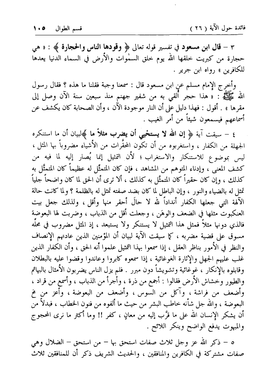 4 - سيقت آية إِنَّ اللَّهَ لا يَسْتَحْيِي أَنْ يَضْرِبَ مَثَلًا ما لبيان أن ما استنكره الجهلة من الكفار، واستغربوه من أن تكون المحقرات من الأشياء مضروبا بها المثل، ليس بموضوع للاستنكار والاستغراب؛ لأن التمثيل إنما يصار إليه لما فيه من كشف المعنى، وإدناء المتوهم من المشاهد، فإن كان المتمثل له عظيما كان المتمثل به كذلك، وإن كان حقيرا كان المتمثل به كذلك، ألا ترى أن الحق لما كان واضحا جليا تمثل له بالضياء والنور، وإن الباطل لما كان بضد صفته تمثل له بالظلمة؟ ولما كانت حالة الآلهة التي جعلها الكفار أندادا لله لا حال أحقر منها وأقل، ولذلك جعل بيت العنكبوت مثلها في الضعف والوهن، وجعلت أقل من الذباب، وضربت لها البعوضة فالذي دونها مثلا فمثل هذا التمثيل لا يستنكر ولا يستبعد، إذ المثل مضروب في محله مسوق على قضية مضربه، كما سيقت الآية لبيان أن المؤمنين الذين عادتهم الإنصاف والنظر في الأمور بناظر العقل، إذا سمعوا بهذا التمثيل علموا أنه الحق، وأن الكفار الذين غلب عليهم الجهل والإثارة الغوغائية، إذا سمعوه كابروا وعاندوا وقضوا عليه بالبطلان وقابلوه بالإنكار، غوغائية وتشويشا دون مبرر. فلم يزل الناس يضربون الأمثال بالبهائم والطيور وخشاش الأرض فقالوا: أجمع من ذرة، وأجرأ من