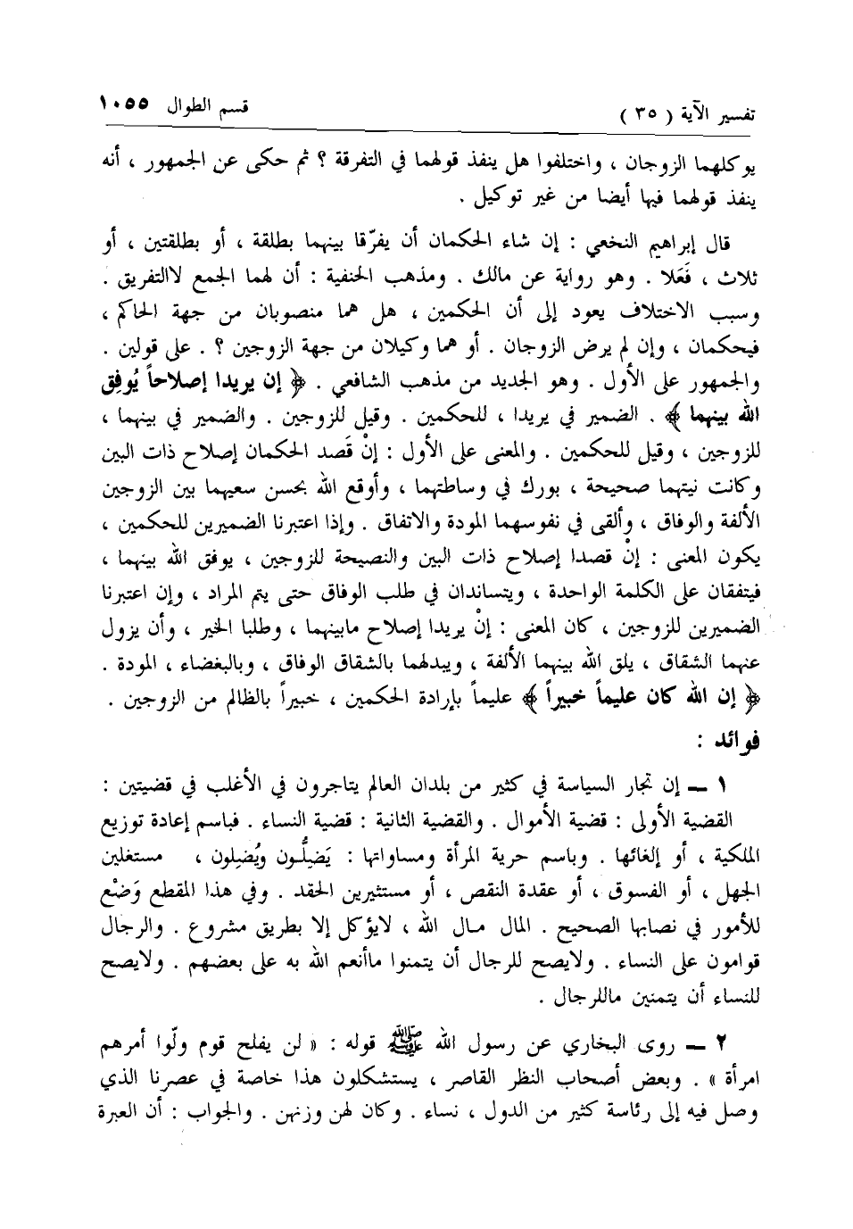 والجمهور على الأول. وهو الجديد من مذهب الشافعي. إِنْ يُرِيدا إِصْلاحاً يُوَفِّقِ اللَّهُ بَيْنَهُما. الضمير في يريدا، للحكمين. وقيل للزوجين. والضمير في بينهما، للزوجين، وقيل للحكمين. والمعنى على الأول: إن قصد الحكمان إصلاح ذات البين وكانت نيتهما صحيحة، بورك في وساطتهما، وأوقع الله بحسن سعيهما بين الزوجين الألفة والوفاق، وألقى في نفوسهما المودة والاتفاق. وإذا اعتبرنا الضميرين للحكمين، يكون المعنى: إن قصدا إصلاح ذات البين والنصيحة للزوجين، يوفق الله بينهما، فيتفقان على الكلمة الواحدة، ويتساندان في طلب الوفاق حتى يتم المراد، وإن اعتبرنا الضميرين للزوجين، كان المعنى: إن يريدا إصلاح ما بينهما، وطلبا الخير، وأن يزول عنهما الشقاق، يلق الله بينهما الألفة، ويبدلهما بالشقاق الوفاق، وبالبغضاء، المودة.