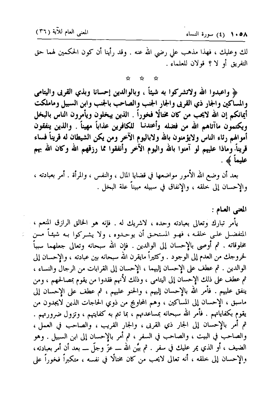 وَاعْبُدُوا اللَّهَ وَلا تُشْرِكُوا بِهِ شَيْئاً، وَبِالْوالِدَيْنِ إِحْساناً وَبِذِي الْقُرْبى وَالْيَتامى وَالْمَساكِينِ وَالْجارِ ذِي الْقُرْبى وَالْجارِ الْجُنُبِ وَالصَّاحِبِ بِالْجَنْبِ وَابْنِ السَّبِيلِ وَما مَلَكَتْ أَيْمانُكُمْ إِنَّ اللَّهَ لا يُحِبُّ مَنْ كانَ مُخْتالًا فَخُوراً. الَّذِينَ يَبْخَلُونَ وَيَأْمُرُونَ النَّاسَ بِالْبُخْلِ وَيَكْتُمُونَ ما آتاهُمُ اللَّهُ مِنْ فَضْلِهِ وَأَعْتَدْنا لِلْكافِرِينَ عَذاباً مُهِيناً. وَالَّذِينَ يُنْفِقُونَ أَمْوالَهُمْ رِئاءَ النَّاسِ وَلا يُؤْمِنُونَ بِاللَّهِ وَلا بِالْيَوْمِ الْآخِرِ وَمَنْ يَكُنِ الشَّيْطانُ لَهُ قَرِيناً فَساءَ قَرِيناً. وَماذا عَلَيْهِمْ لَوْ آمَنُوا بِاللَّهِ وَالْيَوْمِ الْآخِرِ وَأَنْفَقُوا مِمَّا رَزَقَهُمُ اللَّهُ وَكانَ اللَّهُ بِهِمْ عَلِيماً.