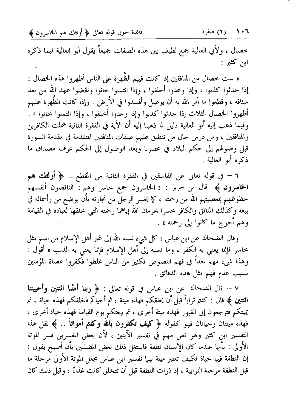 7 - قال الضحاك عن ابن عباس في قوله تعالى: رَبَّنا أَمَتَّنَا اثْنَتَيْنِ وَأَحْيَيْتَنَا اثْنَتَيْنِ قال: كنتم ترابا قبل أن يخلقكم فهذه ميتة، ثم أحياكم فخلقكم فهذه حياة، ثم يميتكم فترجعون إلى القبور فهذه ميتة أخرى، ثم يبعثكم يوم القيامة فهذه حياة أخرى، فهذه ميتتان وحياتان فهو كقوله كَيْفَ تَكْفُرُونَ بِاللَّهِ وَكُنْتُمْ أَمْواتاً .. نقل هذا التفسير ابن كثير وهو نص مهم في تفسير الآيتين، لأن بعض المفسرين فسر الموتة الأولى: بأنها عند ما كان الإنسان نطفة فاستغل ذلك بعض المضللين بأن أصبح يقول: