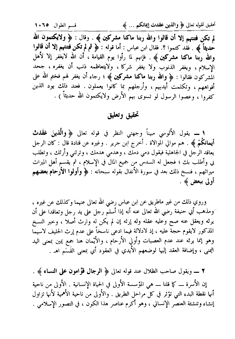 1 - يقول الألوسي مبينا وجهتي النظر في قوله تعالى وَالَّذِينَ عَقَدَتْ أَيْمانُكُمْ. هم موالي الموالاة. أخرج ابن جرير. وغيره عن قتادة قال: كان الرجل يعاقد الرجل في الجاهلية فيقول دمي دمك، وهدمي هدمك، وترثني وأرثك، وتطلب بي وأطلب بك؛ فجعل له السدس من جميع المال في الإسلام، ثم يقسم أهل الميراث ميراثهم، فنسخ ذلك بعد في سورة الأنفال بقوله سبحانه: وَأُولُوا الْأَرْحامِ بَعْضُهُمْ أَوْلى بِبَعْضٍ.