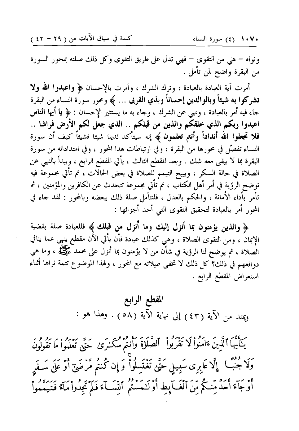 أمرت آية العبادة بالعبادة، وترك الشرك، وأمرت بالإحسان وَاعْبُدُوا اللَّهَ وَلا تُشْرِكُوا بِهِ شَيْئاً وَبِالْوالِدَيْنِ إِحْساناً وَبِذِي الْقُرْبى ... ومحور سورة النساء من البقرة جاء فيه أمر بالعبادة، ونهي عن الشرك، وجاء به ما يستثير الإحسان: يا أَيُّهَا النَّاسُ اعْبُدُوا رَبَّكُمُ الَّذِي خَلَقَكُمْ وَالَّذِينَ مِنْ قَبْلِكُمْ .. الَّذِي جَعَلَ لَكُمُ الْأَرْضَ فِراشاً .. فَلا تَجْعَلُوا لِلَّهِ أَنْداداً وَأَنْتُمْ تَعْلَمُونَ إنه سيتأكد لدينا شيئا فشيئا كيف أن سورة النساء تفصل في محورها من البقرة، وفي ارتباطات هذا المحور، وفي امتداداته من سورة البقرة بما لا يبقى معه شك. وبعد المقطع الثالث، يأتي المقطع الرابع، ويبدأ بالنهي عن الصلاة في حالة السكر، ويبيح التيمم للصلاة في بعض الحالات، ثم تأتي مجموعة فيه توضح الرؤية في أمر أهل الكتاب، ثم تأتي مجموعة تتحدث عن الكافرين والمؤمنين، ثم تأمر بأداء الأمانة، والحكم بالعدل، فلنتأمل صلة ذلك ببعضه وبالمحور: لقد جاء في المحور أمر بالعبادة لتحقيق التقوى التي أحد أجزائها: