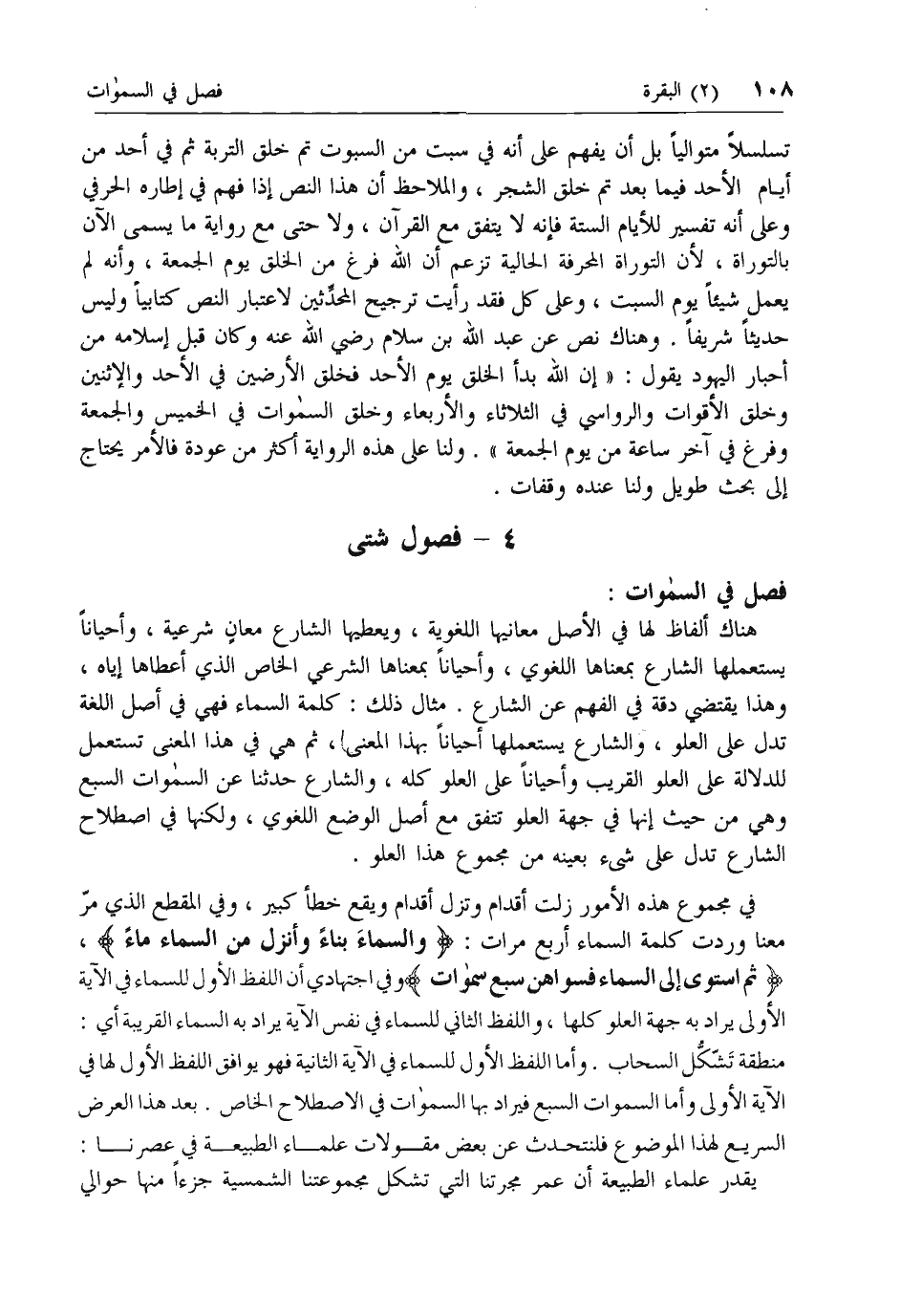 تسلسلا متواليا بل أن يفهم على أنه في سبت من السبوت تم خلق التربة ثم في أحد من أيام الأحد فيما بعد تم خلق الشجر، والملاحظ أن هذا النص إذا فهم في إطاره الحرفي وعلى أنه تفسير للأيام الستة فإنه لا يتفق مع القرآن، ولا حتى مع رواية ما يسمى الآن بالتوراة، لأن التوراة المحرفة الحالية تزعم أن الله فرغ من الخلق يوم الجمعة، وأنه لم يعمل شيئا يوم السبت، وعلى كل فقد رأيت ترجيح المحدثين لاعتبار النص كتابيا وليس حديثا شريفا. وهناك نص عن عبد الله بن سلام رضي الله عنه