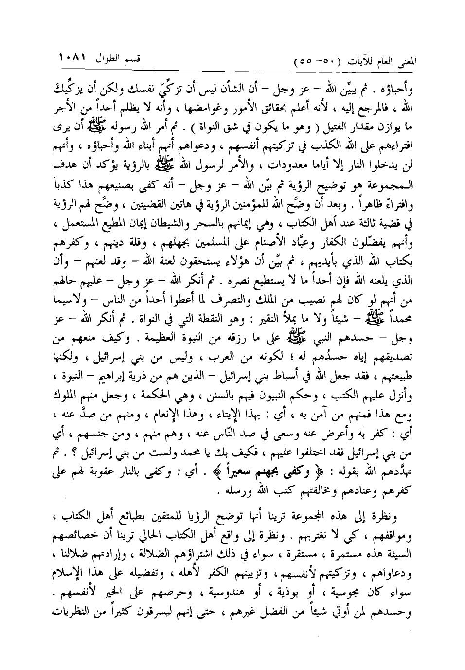 وأحباؤه. ثم يبين الله- عزّ وجل- أن الشأن ليس أن تزكي نفسك ولكن أن يزكيك الله، فالمرجع إليه، لأنه أعلم بحقائق الأمور وغوامضها، وأنه لا يظلم أحدا من الأجر ما يوازن مقدار الفتيل (وهو ما يكون في شق النواة). ثم أمر الله رسوله صلى الله عليه وسلم أن يرى افتراءهم على الله الكذب في تزكيتهم أنفسهم، ودعواهم أنهم أبناء الله وأحباؤه، وأنهم لن يدخلوا النار إلا أياما معدودات، والأمر لرسول الله صلى الله عليه وسلم بالرؤية يؤكد أن هدف المجموعة هو توضيح الرؤية ثم بين الله- عزّ وجل- أنه كفى بصنيعهم هذا كذبا وافتراء ظاهرا. وبعد أن وضح الله للمؤمنين الرؤية في هاتين القضيتين، وضح لهم الرؤية في قضية ثالثة عند أهل الكتاب، وهي إيمانهم بالسحر والشيطان إيمان المطيع المستعمل، وأنهم يفضلون الكفار وعباد الأصنام على المسلمين بجهلهم، وقلة دينهم، وكفرهم بكتاب الله الذي بأيديهم، ثم بين أن هؤلاء يستحقون لعنة الله- وقد لعنهم- وأن الذي يلعنه الله فإن أحدا ما لا يستطيع نصره. ثم أنكر الله- عزّ وجل- عليهم حالهم من أنهم لو كان لهم نصيب من الملك والتصرف لما أعطوا أحدا من الناس- ولا سيما محمدا صلى الله عليه وسلم- شيئا ولا ما يملأ النقير: وهو النقطة التي في النواة. ثم أنكر الله- عزّ وجل- حسدهم النبي صلى