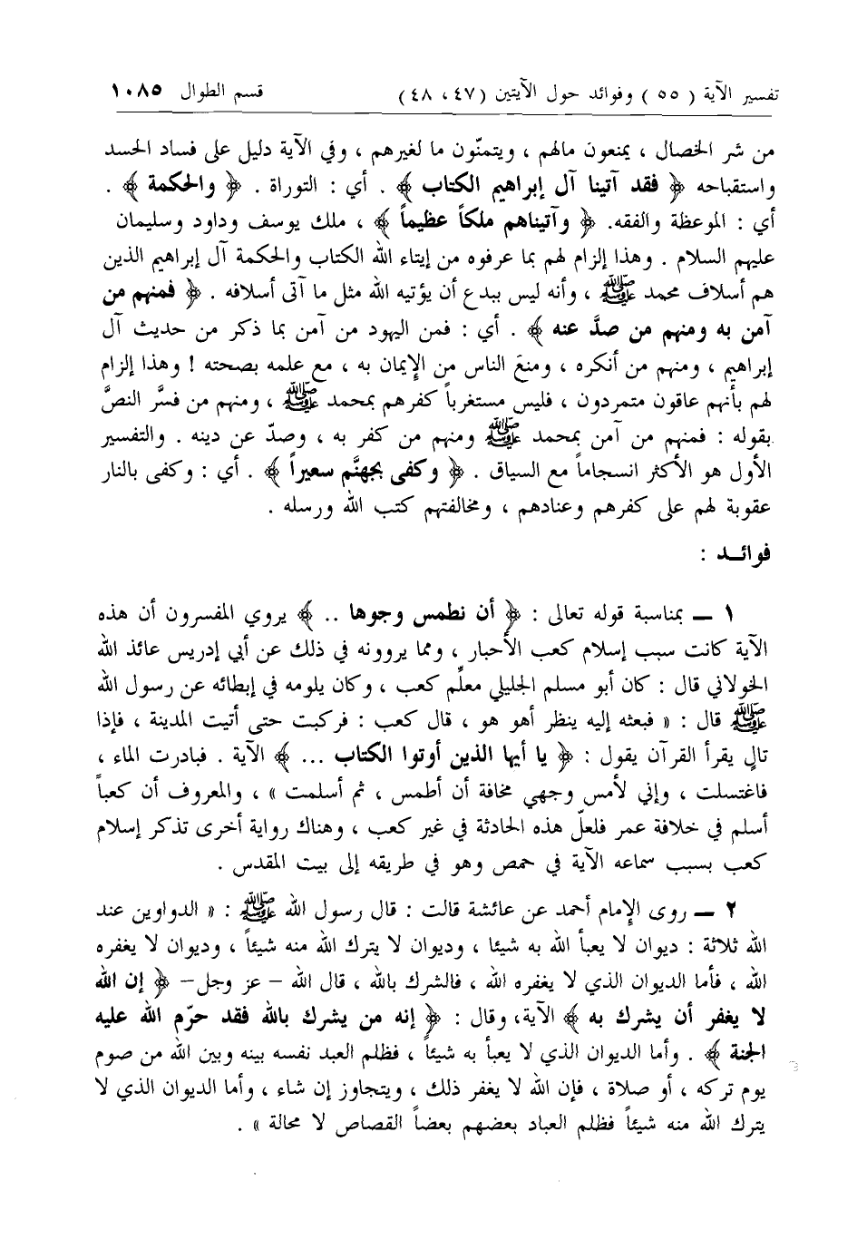 1 - بمناسبة قوله تعالى: أَنْ نَطْمِسَ وُجُوهاً .. يروي المفسرون أن هذه الآية كانت سبب إسلام كعب الأحبار، ومما يروونه في ذلك عن أبي إدريس عائذ الله الخولاني قال: كان أبو مسلم الجليلي معلم كعب، وكان يلومه في إبطائه عن رسول الله صلى الله عليه وسلم قال: «فبعثه إليه ينظر أهو هو، قال كعب: فركبت حتى أتيت المدينة، فإذا تال يقرأ القرآن يقول: يا أَيُّهَا الَّذِينَ أُوتُوا الْكِتابَ ... الآية. فبادرت الماء، فاغتسلت، وإني لأمس وجهي مخافة أن أطمس، ثم أسلمت»، والمعروف أن كعبا أسلم في خلافة عمر فلعل هذه الحادثة في غير كعب، وهناك رواية أخرى تذكر إسلام كعب بسبب سماعه الآية في حمص وهو في طريقه إلى بيت المقدس.