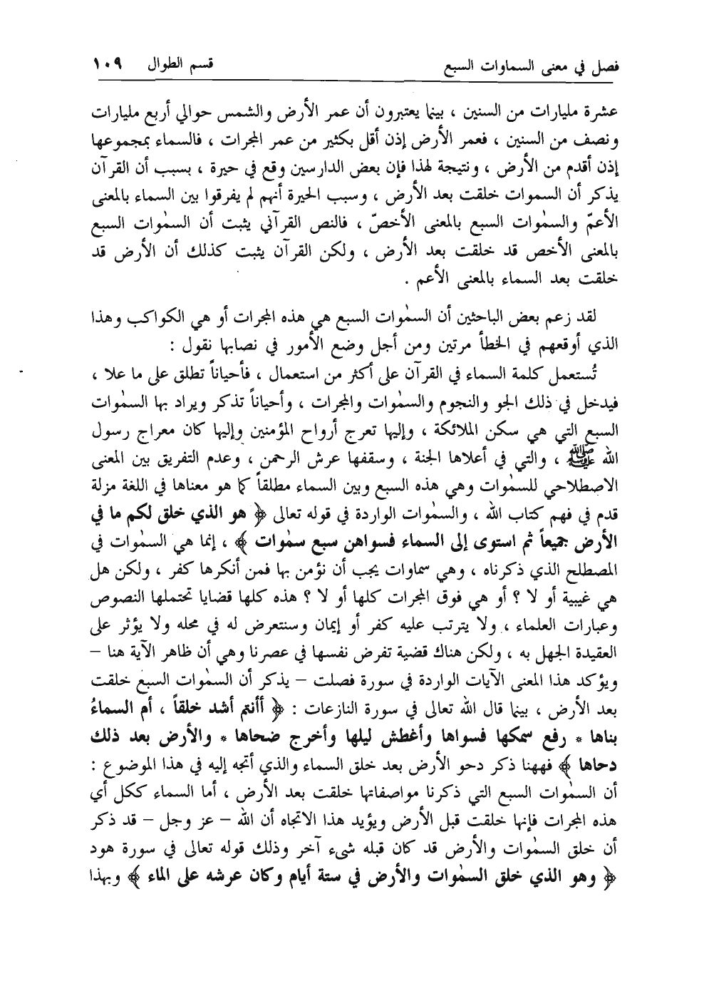 عشرة مليارات من السنين، بينما يعتبرون أن عمر الأرض والشمس حوالي أربع مليارات ونصف من السنين، فعمر الأرض إذن أقل بكثير من عمر المجرات، فالسماء بمجموعها إذن أقدم من الأرض، ونتيجة لهذا فإن بعض الدارسين وقع في حيرة، بسبب أن القرآن يذكر أن السموات خلقت بعد الأرض، وسبب الحيرة أنهم لم يفرقوا بين السماء بالمعنى الأعم والسموات السبع بالمعنى الأخص، فالنص القرآني يثبت أن السموات السبع بالمعنى الأخص قد خلقت بعد الأرض، ولكن القرآن يثبت كذلك أن الأرض قد خلقت بعد السماء بالمعنى الأعم.