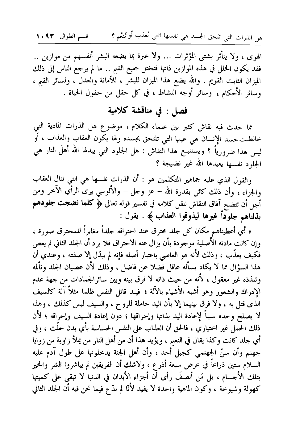 مما حدث فيه نقاش كثير بين علماء الكلام، موضوع هل الذرات المادية التي خالطت جسد الإنسان هي عينها التي تلتحق بجسده ولها يكون العقاب والعذاب، أو ليس هذا ضروريا؟ ويستتبع هذا النقاش: هل الجلود التي يبدلها الله أهل النار هي الجلود نفسها يعيدها الله غير نضيجة؟