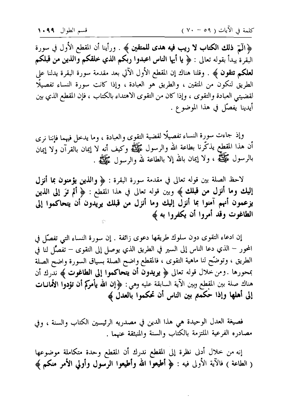 الم ذلِكَ الْكِتابُ لا رَيْبَ فِيهِ هُدىً لِلْمُتَّقِينَ. ورأينا أن المقطع الأول في سورة البقرة يبدأ بقوله تعالى: يا أَيُّهَا النَّاسُ اعْبُدُوا رَبَّكُمُ الَّذِي خَلَقَكُمْ وَالَّذِينَ مِنْ قَبْلِكُمْ لَعَلَّكُمْ تَتَّقُونَ. وقلنا هناك إن المقطع الأول الآتي بعد مقدمة سورة البقرة يدلنا على الطريق لنكون من المتقين، والطريق هو العبادة، وإذا كانت سورة النساء تفصيلا لقضيتي العبادة والتقوى، وإذا كان من التقوى الاهتداء بالكتاب، فإن المقطع الذي بين أيدينا يفصل في هذا الموضوع.