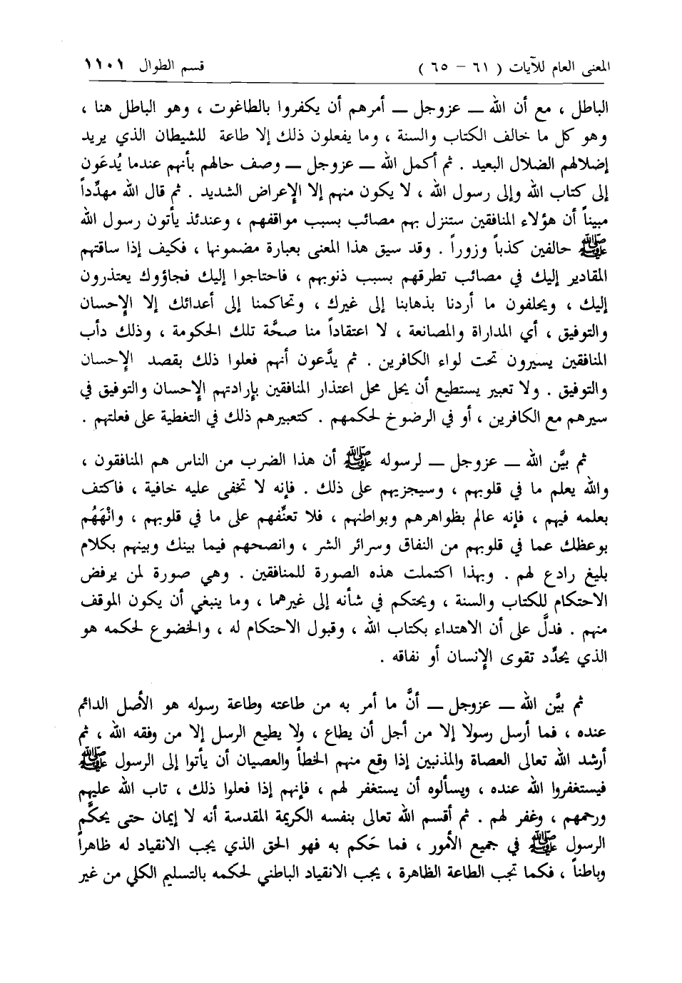 ثم بين الله- عزّ وجل- أن ما أمر به من طاعته وطاعة رسوله هو الأصل الدائم عنده، فما أرسل رسولا إلا من أجل أن يطاع، ولا يطيع الرسل إلا من وفقه الله، ثم أرشد الله تعالى العصاة والمذنبين إذا وقع منهم الخطأ والعصيان أن يأتوا إلى الرسول صلى الله عليه وسلم فيستغفروا الله عنده، ويسألوه أن يستغفر لهم، فإنهم إذا فعلوا ذلك، تاب الله عليهم ورحمهم، وغفر لهم. ثم أقسم الله تعالى بنفسه الكريمة المقدسة أنه لا إيمان حتى يحكم الرسول صلى الله عليه وسلم في جميع الأمور، فما حكم به فهو الحق الذي يجب الانقياد له ظاهرا وباطنا، فكما تجب الطاعة الظاهرة، يجب الانقياد الباطني لحكمه بالتسليم الكلي من غير