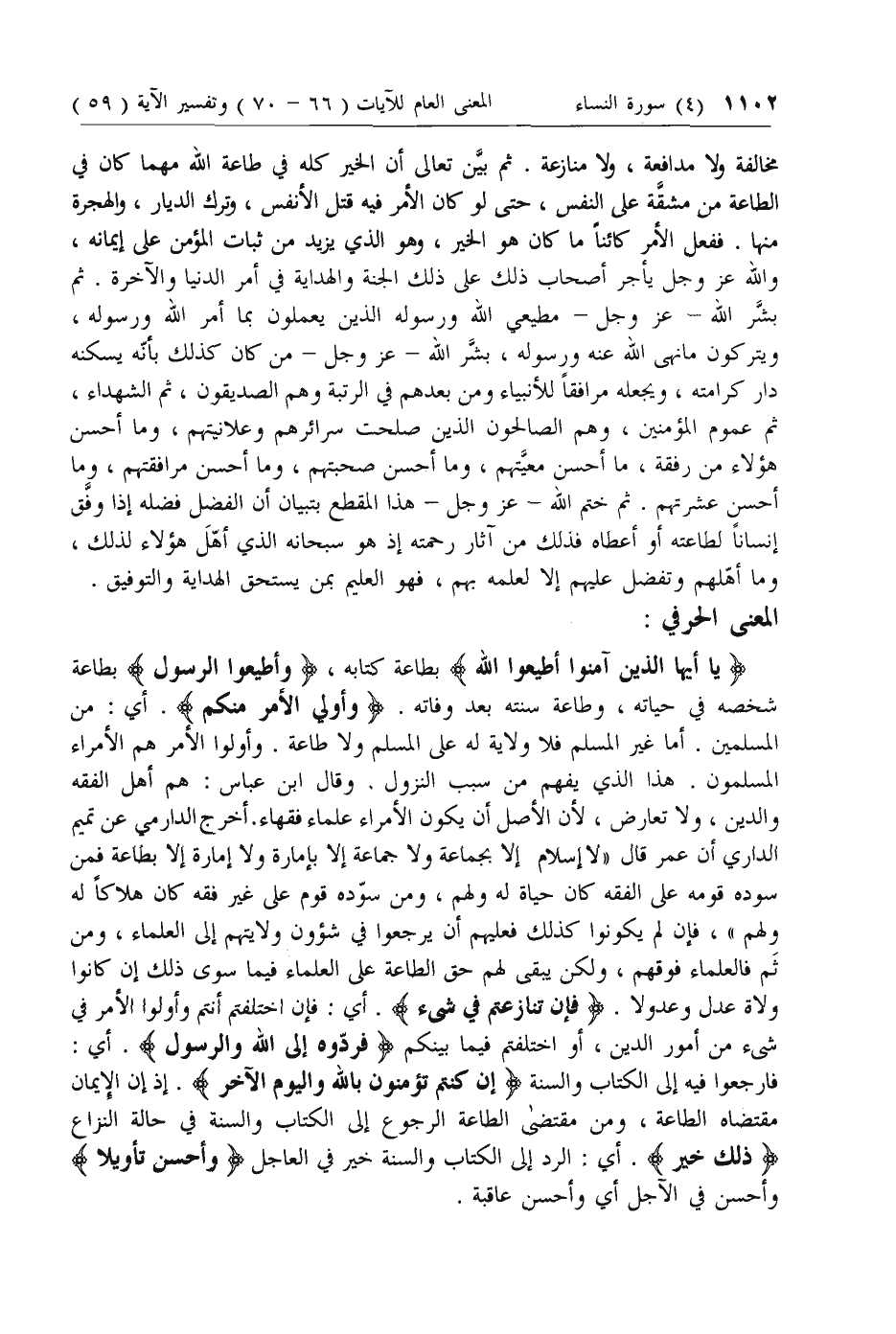 يا أَيُّهَا الَّذِينَ آمَنُوا أَطِيعُوا اللَّهَ بطاعة كتابه، وَأَطِيعُوا الرَّسُولَ بطاعة شخصه في حياته، وطاعة سنته بعد وفاته. وَأُولِي الْأَمْرِ مِنْكُمْ. أي: من المسلمين. أما غير المسلم فلا ولاية له على المسلم ولا طاعة. وأولو الأمر هم الأمراء المسلمون. هذا الذي يفهم من سبب النزول. وقال ابن عباس: هم أهل الفقه والدين، ولا تعارض، لأن الأصل أن يكون الأمراء علماء فقهاء. أخرج الدارمي عن تميم الداري أن عمر قال «لا إسلام إلا بجماعة ولا جماعة إلا بإمارة ولا إمارة إلا بطاعة فمن سوده قومه على الفقه كان حياة له ولهم، ومن سوده قوم على غير فقه كان هلاكا له ولهم»، فإن لم يكونوا كذلك فعليهم أن يرجعوا في شئون ولايتهم إلى العلماء، ومن ثم فالعلماء فوقهم، ولكن يبقى لهم حق الطاعة على العلماء فيما سوى ذلك إن كانوا ولاة عدل وعدولا. فَإِنْ تَنازَعْتُمْ فِي شَيْءٍ. أي: فإن اختلفتم أنتم وأولو الأمر في شئ من أمور الدين، أو اختلفتم فيما بينكم فَرُدُّوهُ إِلَى اللَّهِ وَالرَّسُولِ. أي: