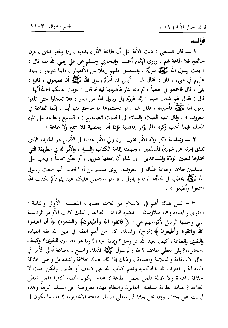 1 - قال النسفي: دلت الآية على أن طاعة الأمراء واجبة، إذا وافقوا الحق، فإن خالفوه فلا طاعة لهم. وروى الإمام أحمد والبخاري ومسلم عن علي رضي الله عنه قال: