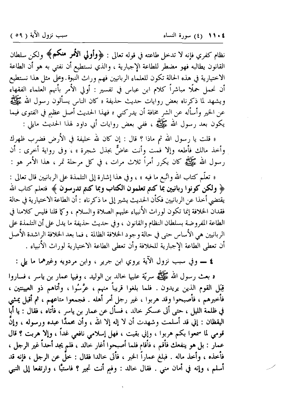 نظام كفري فإنه لا تدخل طاعته في قوله تعالى: وَأُولِي الْأَمْرِ مِنْكُمْ ولكن سلطان القانون يطالبه فهو مضطر للطاعة الإجبارية، والذي نستطيع أن نفتي به هو أن الطاعة الاختيارية في هذه الحالة تكون للعلماء الربانيين فهم وراث النبوة. وعلى مثل هذا نستطيع أن نحمل حملا مباشرا كلام ابن عباس في تفسير: أولي الأمر بأنهم العلماء الفقهاء ويشهد لما ذكرناه بعض روايات حديث حذيفة «كان الناس يسألون رسول الله صلى الله عليه وسلم عن الخير وأسأله عن الشر مخافة أن يدركني» فهذا الحديث أصل عظيم في الفتوى فيما يكون بعد رسول الله صلى الله عليه وسلم، ففي بعض روايات أبي داود لهذا الحديث ما يلي: