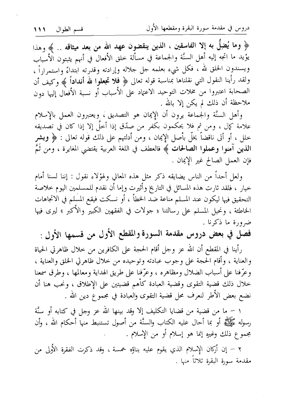 فصل في بعض دروس مقدمة السورة والمقطع الأول من قسمها الأول: