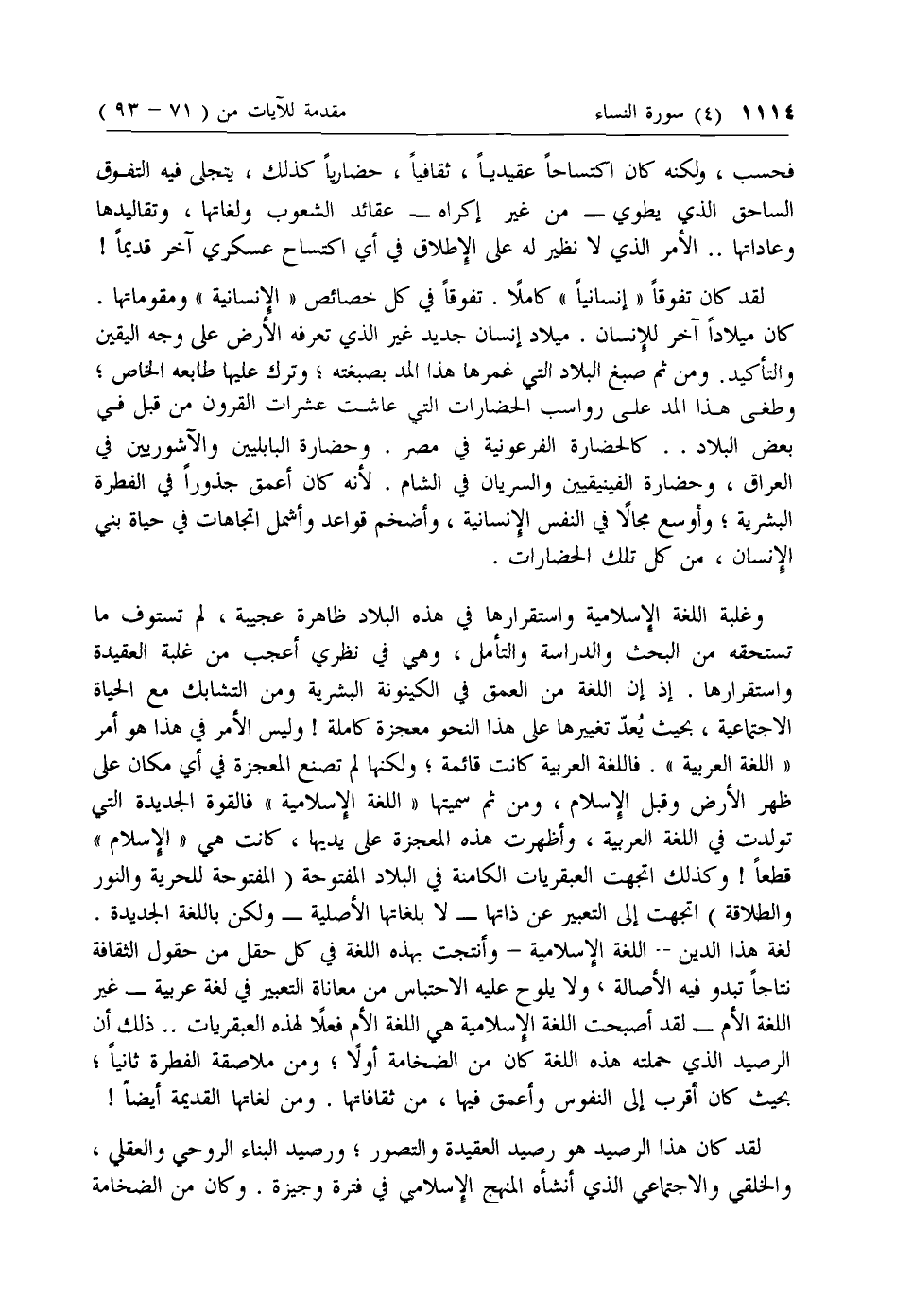 وغلبة اللغة الإسلامية واستقرارها في هذه البلاد ظاهرة عجيبة، لم تستوف ما تستحقه من البحث والدراسة والتأمل، وهي في نظري أعجب من غلبة العقيدة واستقرارها. إذ إن اللغة من العمق في الكينونة البشرية ومن التشابك مع الحياة الاجتماعية، بحيث يعد تغييرها على هذا النحو معجزة كاملة! وليس الأمر في هذا هو أمر «اللغة العربية». فاللغة العربية كانت قائمة؛ ولكنها لم تصنع المعجزة في أي مكان على ظهر الأرض وقبل الإسلام، ومن ثم سميتها «اللغة الإسلامية» فالقوة الجديدة التي تولدت في اللغة العربية، وأظهرت هذه المعجزة على يديها، كانت هي «الإسلام» قطعا! وكذلك اتجهت العبقريات الكامنة في البلاد المفتوحة (المفتوحة للحرية والنور والطلاقة) اتجهت إلى التعبير عن ذاتها- لا بلغاتها الأصلية- ولكن باللغة الجديدة.