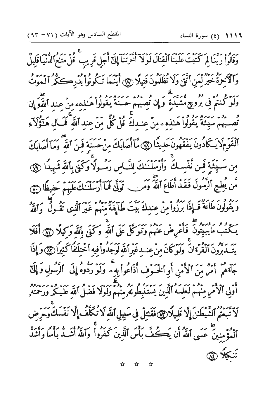 أَلَمْ تَرَ إِلَى الَّذِينَ قِيلَ لَهُمْ كُفُّوا أَيْدِيَكُمْ وَأَقِيمُوا الصَّلاةَ وَآتُوا الزَّكاةَ فَلَمَّا كُتِبَ عَلَيْهِمُ الْقِتالُ إِذا فَرِيقٌ مِنْهُمْ يَخْشَوْنَ النَّاسَ كَخَشْيَةِ اللَّهِ أَوْ أَشَدَّ خَشْيَةً وَقالُوا رَبَّنا لِمَ كَتَبْتَ عَلَيْنَا الْقِتالَ لَوْلا أَخَّرْتَنا إِلى أَجَلٍ قَرِيبٍ قُلْ مَتاعُ الدُّنْيا قَلِيلٌ وَالْآخِرَةُ خَيْرٌ لِمَنِ اتَّقى وَلا تُظْلَمُونَ فَتِيلاً (77) أَيْنَما تَكُونُوا يُدْرِكْكُمُ الْمَوْتُ وَلَوْ كُنْتُمْ فِي بُرُوجٍ مُشَيَّدَةٍ وَإِنْ تُصِبْهُمْ حَسَنَةٌ يَقُولُوا هذِهِ مِنْ عِنْدِ اللَّهِ وَإِنْ تُصِبْهُمْ سَيِّئَةٌ يَقُولُوا هذِهِ مِنْ عِنْدِكَ قُلْ كُلٌّ مِنْ عِنْدِ اللَّهِ فَمالِ هؤُلاءِ الْقَوْمِ لا يَكادُونَ يَفْقَهُونَ حَدِيثاً (78) ما أَصابَكَ مِنْ حَسَنَةٍ فَمِنَ اللَّهِ وَما أَصابَكَ مِنْ سَيِّئَةٍ فَمِنْ نَفْسِكَ وَأَرْسَلْناكَ لِلنَّاسِ رَسُولاً وَكَفى بِاللَّهِ شَهِيداً (79) مَنْ يُطِعِ الرَّسُولَ فَقَدْ أَطاعَ اللَّهَ وَمَنْ تَوَلَّى فَما أَرْسَلْناكَ عَلَيْهِمْ حَفِيظاً (80) وَيَقُولُونَ طاعَةٌ فَإِذا بَرَزُوا مِنْ عِنْدِكَ بَيَّتَ طائِفَةٌ مِنْهُمْ غَيْرَ الَّذِي تَقُولُ وَاللَّهُ يَكْتُبُ ما يُبَيِّتُونَ فَأَعْرِضْ عَنْهُمْ وَتَوَكَّلْ عَلَى اللَّهِ وَكَفى بِاللَّهِ وَكِيلاً (81)
