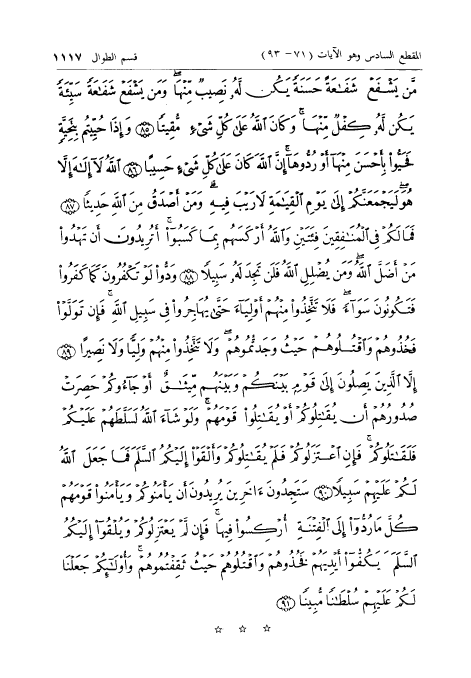 مَنْ يَشْفَعْ شَفاعَةً حَسَنَةً يَكُنْ لَهُ نَصِيبٌ مِنْها وَمَنْ يَشْفَعْ شَفاعَةً سَيِّئَةً يَكُنْ لَهُ كِفْلٌ مِنْها وَكانَ اللَّهُ عَلى كُلِّ شَيْءٍ مُقِيتاً (85) وَإِذا حُيِّيتُمْ بِتَحِيَّةٍ فَحَيُّوا بِأَحْسَنَ مِنْها أَوْ رُدُّوها إِنَّ اللَّهَ كانَ عَلى كُلِّ شَيْءٍ حَسِيباً (86) اللَّهُ لا إِلهَ إِلاَّ هُوَ لَيَجْمَعَنَّكُمْ إِلى يَوْمِ الْقِيامَةِ لا رَيْبَ فِيهِ وَمَنْ أَصْدَقُ مِنَ اللَّهِ حَدِيثاً (87) فَما لَكُمْ فِي الْمُنافِقِينَ فِئَتَيْنِ وَاللَّهُ أَرْكَسَهُمْ بِما كَسَبُوا أَتُرِيدُونَ أَنْ تَهْدُوا مَنْ أَضَلَّ اللَّهُ وَمَنْ يُضْلِلِ اللَّهُ فَلَنْ تَجِدَ لَهُ سَبِيلاً (88) وَدُّوا لَوْ تَكْفُرُونَ كَما كَفَرُوا فَتَكُونُونَ سَواءً فَلا تَتَّخِذُوا مِنْهُمْ أَوْلِياءَ حَتَّى يُهاجِرُوا فِي سَبِيلِ اللَّهِ فَإِنْ تَوَلَّوْا فَخُذُوهُمْ وَاقْتُلُوهُمْ حَيْثُ وَجَدْتُمُوهُمْ وَلا تَتَّخِذُوا مِنْهُمْ وَلِيًّا وَلا نَصِيراً (89)