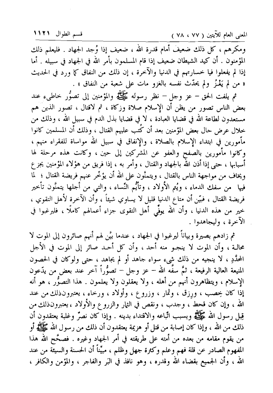 ثم يلفت الحق- عزّ وجل- نظر رسوله صلى الله عليه وسلم والمؤمنين إلى تصور خاطئ عند بعض الناس تصور من يظن أن الإسلام صلاة وزكاة، ثم لا قتال، تصور الذين هم مستعدون لطاعة الله في قضايا العبادة، لا في قضايا بذل الدم في سبيل الله، وذلك من خلال عرض حال بعض المؤمنين بعد أن كتب عليهم القتال، وذلك أن المسلمين كانوا مأمورين في ابتداء الإسلام بالصلاة، والإنفاق في سبيل الله مواساة للفقراء منهم، وكانوا مأمورين بالصفح والعفو عن المشركين إلى حين، وكانت هذه مرحلة لها أسبابها، حتى إذا أذن الله بالجهاد والقتال، وأمر به، إذا فريق من هؤلاء المؤمنين يجزع ويخاف من مواجهة الناس بالقتال، ويتمنون على الله أن يؤخر عنهم فريضة القتال؛ لما فيها من سفك الدماء، ويتم الأولاد، وتأيم النساء، والتي من أجلها يتمنون تأخير فريضة القتال، فبين أن متاع الدنيا قليل لا يساوي شيئا، وأن الآخرة لأهل التقوي، خير من هذه الدنيا، وأن الله يوفي أهل التقوى جزاء أعمالهم كاملا، فليرغبوا في الآخرة، وليجاهدوا.